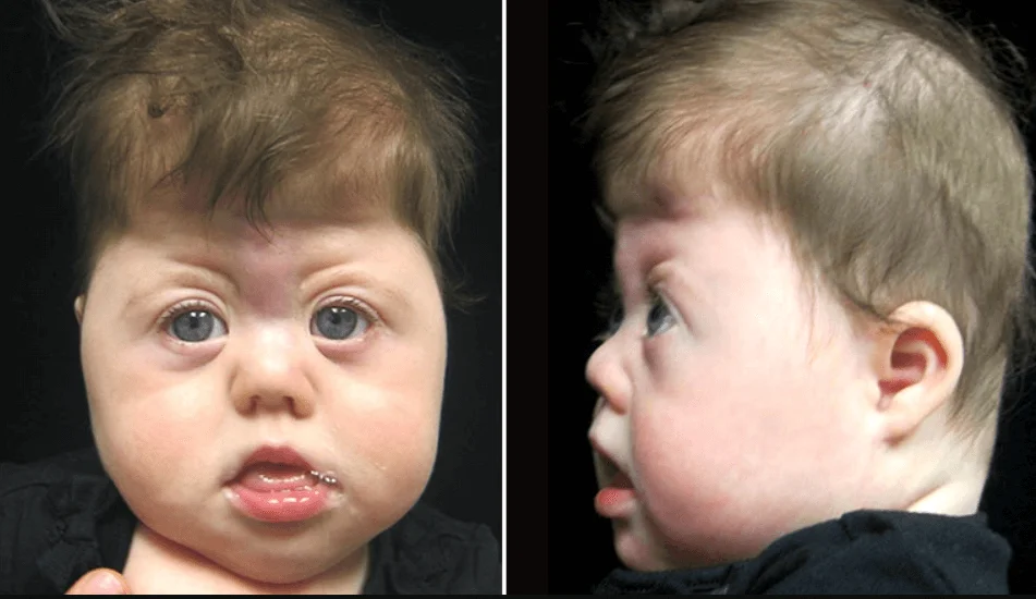 - Široký nebo rozštěpený nos: Nos může mít široký nebo rozštěpený vzhled.