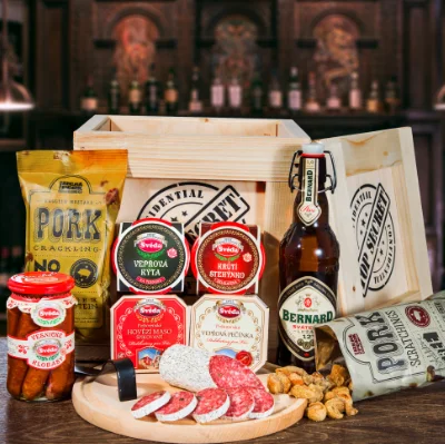 Bedna s dobrotami a pitím je originální dárek pro muže na Vánoce