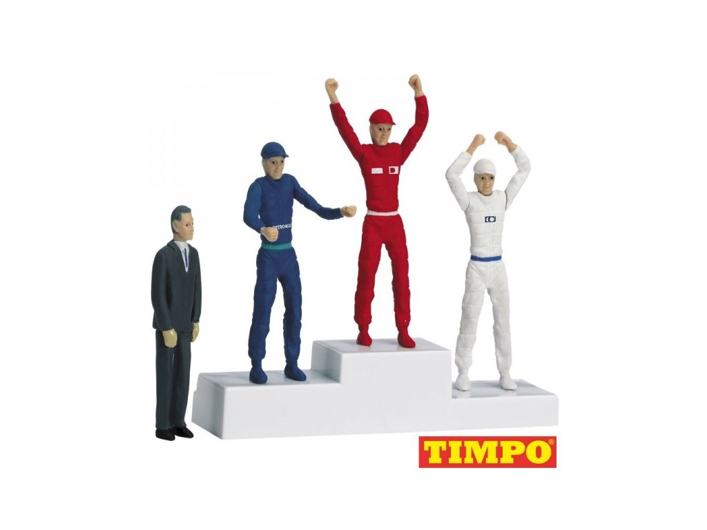 Stupeň vítězů s figurkami (3 závodnící, 1 pořadatel). Postavy mají pohyblivé části.