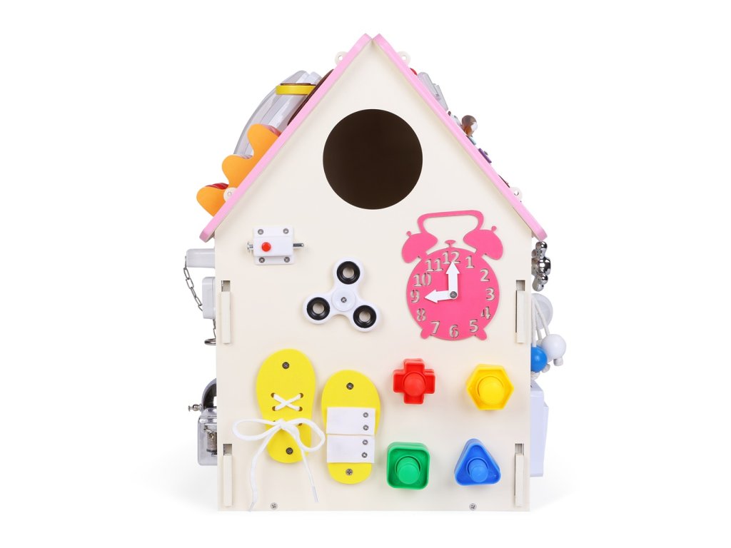 Od zvonku až k telefonu! Tento domeček přináší spoustu zábavy, díky které bude moci Vaše dítě rozvíjet svou zručnost, zvídavost a zejména jemnou motoriku. Zámky, pásky a tkaničky dávají dítěti možnost procvičovat různé vázaní, spojování, otáčení či otevírání a připravit se tak zábavným způsobem na každodenní úkony. Mimo aktivit zapojující smyslové dovednosti deska disponuje i edukativními prvky jako např. počítadlo nebo hodiny. Domeček se dodává složený v krabici. Hlavní vlastnosti: podporuje nezávislost, jemnou motoriku a koordinaci ruka-okopodněcuje kreativní myšlení a vývoj představivostitelefonní sluchátko neobsahuje kabel, což eliminuje riziko uškrcenísenzorická stimulaceedukace skrze hrudomeček se dodává složený v krabici
