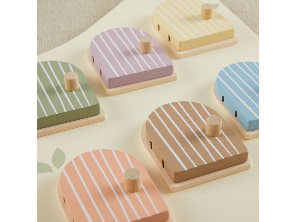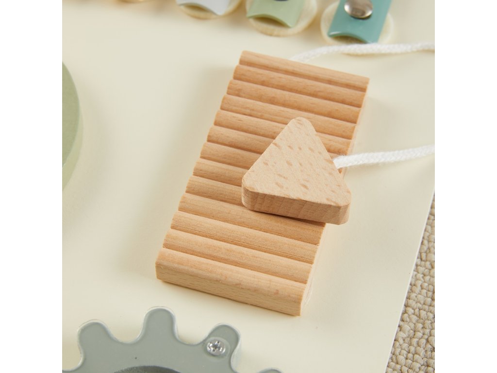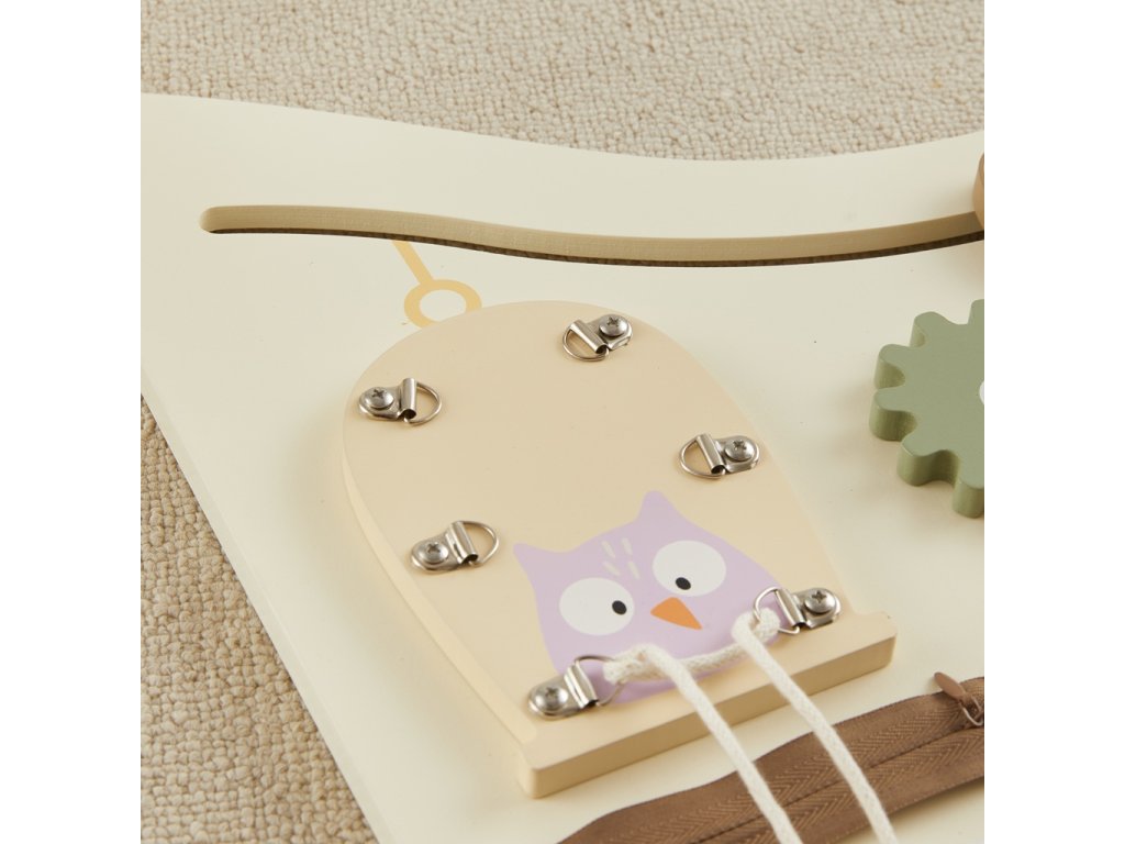 Tato velká dřevěná motorická deska ve tvaru sovy v jemných pastelových barvách zaujme děti už na první pohled. A to nejen svým roztomilým vzhledem, ale hlavně pestrou nabídkou aktivit. Na roztažených křídlech najdou děti více než deset různorodých herních prvků: xylofon, ozubená kolečka, zrcátko, bludiště, posuvné a otevírací prvky, magnetickou tabulku s magnety, dvířka s hmatovým překvapením uvnitř a různě barevné korálky. Všechny tyto detaily děti motivují ke zkoumání, objevování a hravému učení. Děti si při hře procvičí jemnou motoriku, logické myšlení, smyslové vnímání i koordinaci ruka–oko a to vše zábavnou formou. Deska je dostatečně velká pro skupinovou hru. Zároveň působí jako stylová dekorace do dětského pokoje nebo herny. Hlavní vlastnosti: velká motorická deska ve tvaru sovyjemné pastelové barvy v kombinaci s přírodním dřevemvíce než 10 různorodých aktivitrozvíjí motoriku, logiku a smyslové vnímáníkvalitní a bezpečné zpracovánívhodná od 3 letedukativní hračka i stylová dekorace