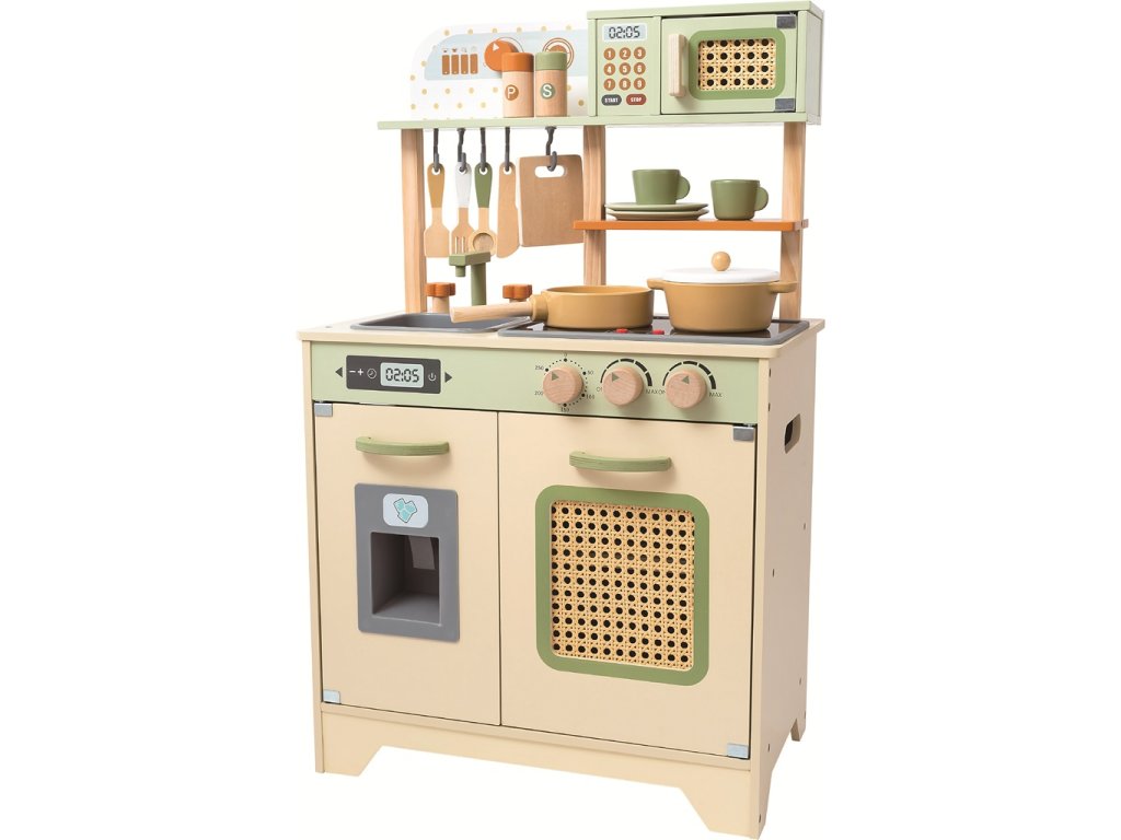 Je libo teplý domácí koláček? Nebo snad máte chuť na něco smaženého? S touto kuchyňkou můžete mít menu dle Vašeho přání. Je totiž plně vybavená! Najdete zde vše, co v moderní kuchyni nesmí chybět - sporák s troubou, výrobník ledu, mikrovlnku, dřez, kávovar a samozřejmě nádobí s náčiním, jako jsou talíře, hrnec, pánev, hrnečky, nůž, naběračka a další. Díky otevíracím dvířkům a otočným knoflíkům je požitek ze hry ještě realističtější. Vše je vyrobeno z kvalitního pevného dřeva a ošetřeno netoxickými barvami. Tak si nasaďte kuchařskou čepici, oblečte zástěru a dejte se do vaření! Obsah balení: 2x talíř, 2x hrneček, 1x pánev, 1x hrnec, 1x poklička, 1x pepřenka, 1x solnička, 1x prkýnko, 4 ks náčiní, rošt do trouby. Hlavní vlastnosti: součástí je bohaté příslušenstvímultifunkční, rozmanité využitírozvíjí komunikační a sociální dovednostimotivuje k představivé hřevhodné pro děti do 3 let