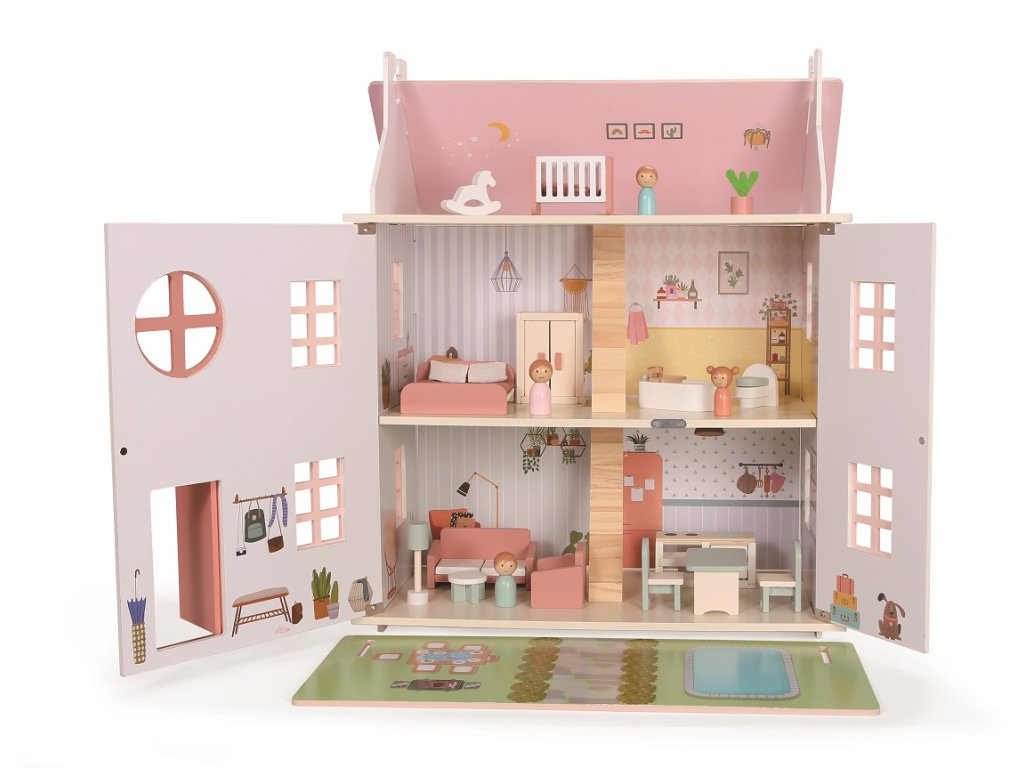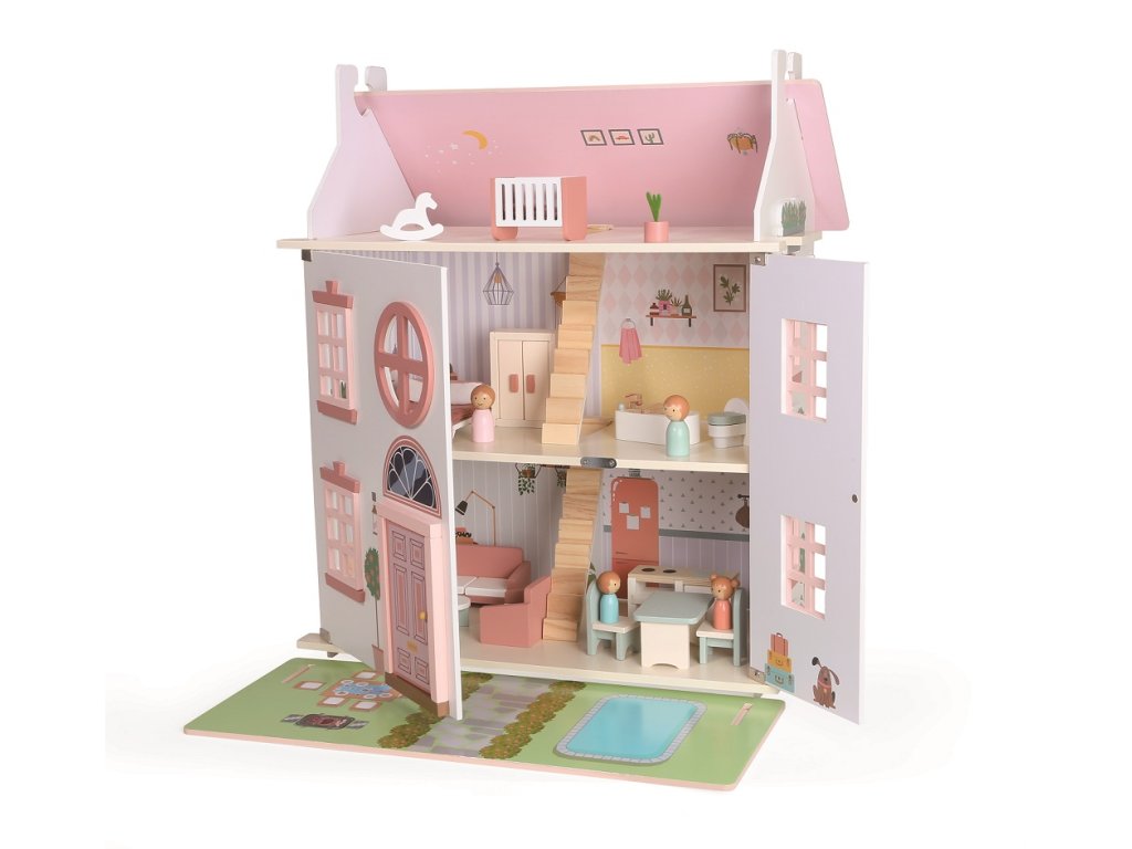 Vítejte v domečku! Na místě, kde příběhy čekají jen na Vás. Díky třem patrům a bohatě prostorným pokojům je pro Vaše malé panenky naprosto ideální. Spolu s rodinkou zde najdete vše, co je u moderní domácnosti zapotřebí – kuchyň, koupelnu, ložnici, obývák i dětský pokoj v podkroví. Sundejte přední část střechy, otočte jí a položte před otevřený domeček a hned máte pro panenky i zahradu s bazénem a nábytkem. Tvořte si rodinné příběhy dle vlastní fantazie! Při hraní děti procvičují komunikační dovednosti, prohlubují sociální interakce a využívají kreativitu Hlavní vlastnosti: oblíbený, tradiční a nadčasový domečekinspiruje k představivé hřetrénuje koordinaci a jemnou motorikuvčetně příslušenství a panenek