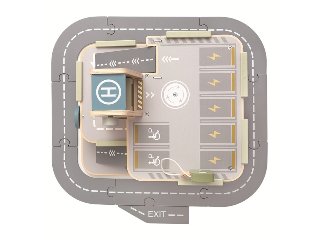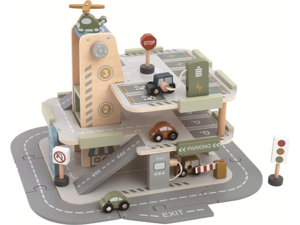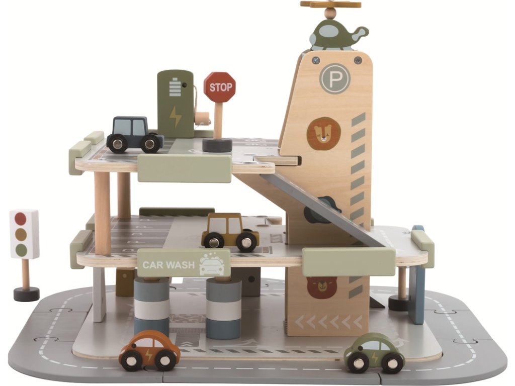 Všem automobilovým nadšencům se rozzáří oči, až uvidí garáž se silnicí, výtahem a heliportem. Umístěte dopravní značky, připravte svá autíčka a hra může začít. Umyjte svůj vůz v auto-myčce. Natankujte pohonné hmoty u stojanu v přízemí. Máte elektro auto? Žádný problém, vyvezte svůj vůz pomocí výtahu a připojte ho k nabíječce ve druhém patře. Baterie je plná? Tak můžete vyrazit. Stala se nehoda? Z heliportu na střeše už startuje vrtulník. Tato edukativní hračka motivuje děti ke kreativní a představivé hře. Rozvíjí koordinaci ruka-oko, jemnou motoriku a zručnost. Garáž s parkovacími plochami na třech úrovních obsahuje také silnici, 4 autíčka, helikoptéru a 3 dopravní značky. Hlavní vlastnosti: 3 podlažígaráž se silnicí, heliportem a výtahem, 4 autíčka, auto-myčka, 2 tankovací stojany (z toho 1 elektro), vrtulník, 3 dopravní značkyinspiruje ke kreativní a představivé hřerozvíjí koordinaci ruka-oko, jemnou motoriku a zručnostvhodné pro děti od 3 let