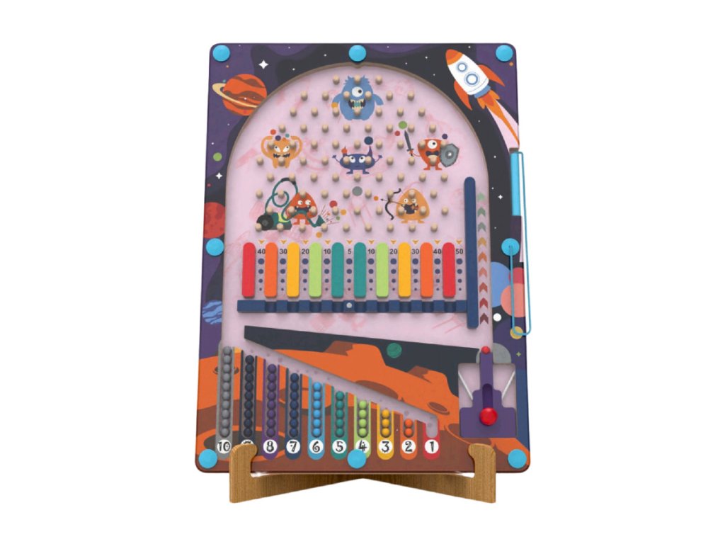 Originální dřevěná hra s vesmírným motivem nabízí dětem hned dvě možnosti, jak si užít spoustu zábavy: klasický pinball s vystřelováním kuliček a magnetickou hru se sbíráním bodů. Barevná hrací deska je navržena tak, aby podporovala zručnost, soustředění a trpělivost. Pomocí vystřelovače (katapultu) se hráči snaží dostat magnetické kuličky co nejpřesněji do vybraných polí a získat co nejvíce bodů. Přehledné uspořádání hrací plochy umožňuje snadné sledování výsledků a zároveň děti učí počítat body. Díky praktickému stojánku lze hru pohodlně postavit na stůl.Zábavná hra, která rozvíjí postřeh, jemnou motoriku a logické myšlení. Ideální pro samostatné hraní nebo zábavné soutěžení s kamarády a rodiči. Hlavní vlastnosti: 2 hry v 1 — pinball + magnetická hrarozvoj jemné motoriky a koordinace ruka–okopodpora trpělivosti, soustředění a logického myšleníprvní seznámení s jednoduchým bodováním a počítánímrobustní a kvalitní provedení ze dřevahravý design s vesmírnými motivy