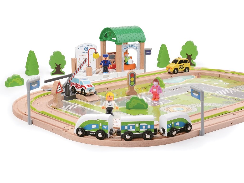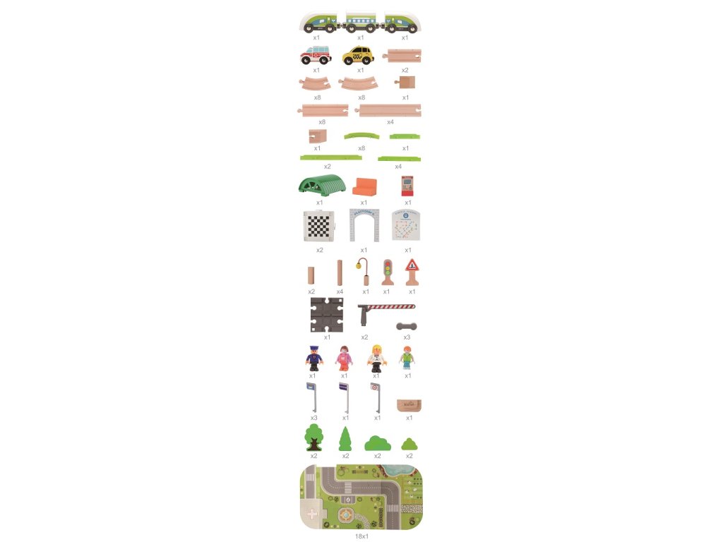 Tato detailně propracovaná dřevěná vláčkodráha s motivem vesničky nabízí dětem nekonečné možnosti hry. Obsahuje vše, co potřebují k vytvoření vlastního malého světa: vláček se třemi vagony, koleje, stanici, zvedací závoru, taxi, sanitku, figurky lidí, semafory, dopravní značky, stromy a potištěnou podložku s ulicemi a přechody. Všechny prvky jsou navrženy tak, aby rozvíjely představivost, jemnou motoriku a fantazii. Každá jízda může být jiná – děti mohou naložit pasažéry, projet vesnicí, zastavit u stanice nebo se vyhnout autům na silnici. Ideální jako dárek nebo doplněk dětského pokojíčku. A pro ještě větší zábavu lze vláčkodráhu kombinovat se sadou Vláčkodráha Město 90 dílů (kód produktu 2D98209) – společně vytvoří barevné a rozmanité železniční městečko!