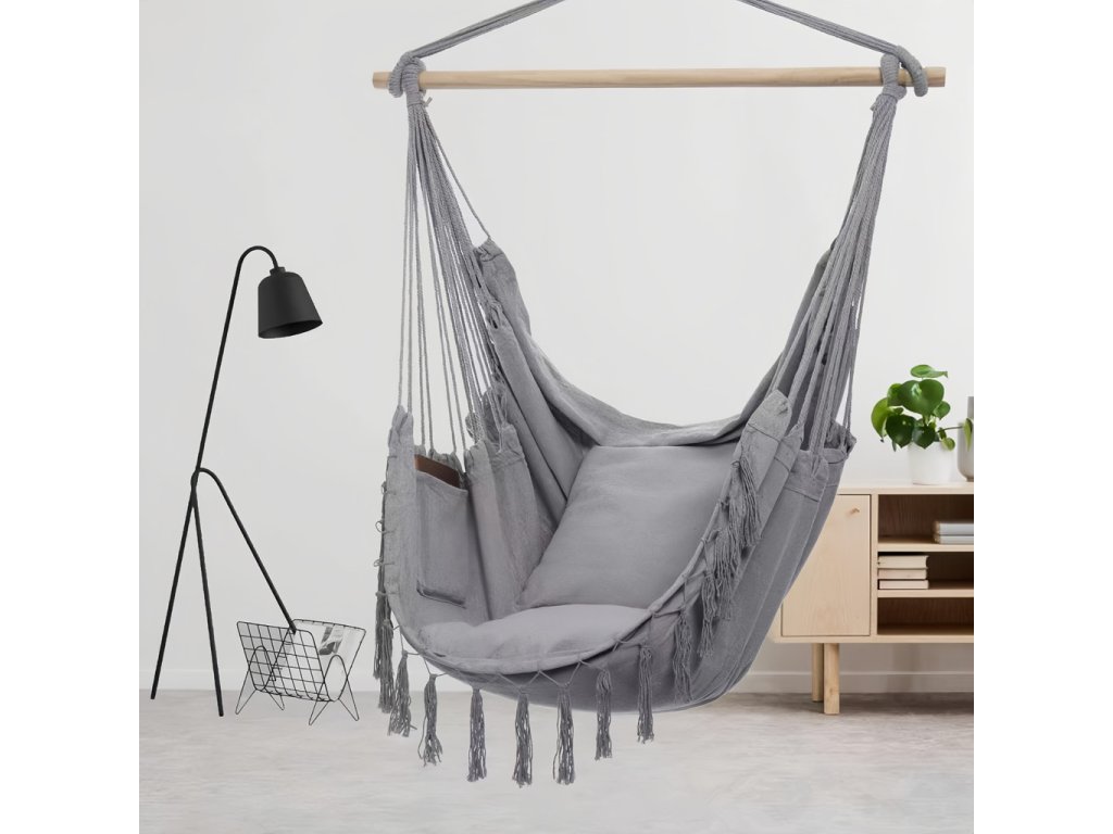 Pohodlí, relaxace a zábava! Závěsné houpací křeslo je ideálním místem pro relaxaci po náročném dni i pro klidné chvíle s oblíbenou knihou. Díky příjemnému bavlněnému materiálu nabízí maximální pohodlí a přirozeně se přizpůsobí tvaru těla. Jemné houpání navozuje pocit uvolnění a pohody, ať už ho umístíte na terasu, do zahrady, nebo do interiéru. Elegantní provedení a vzdušný design z něj dělají nejen pohodlný, ale i stylový doplněk, který dodá každému prostoru nádech útulnosti a lehkosti. Hlavní vlastnosti: vyrobeno ze 100% bavlnypohodlné a bezpečné místo pro odpočinekelegantní šedý designvhodné pro děti od 3 letnosnost 80 kg