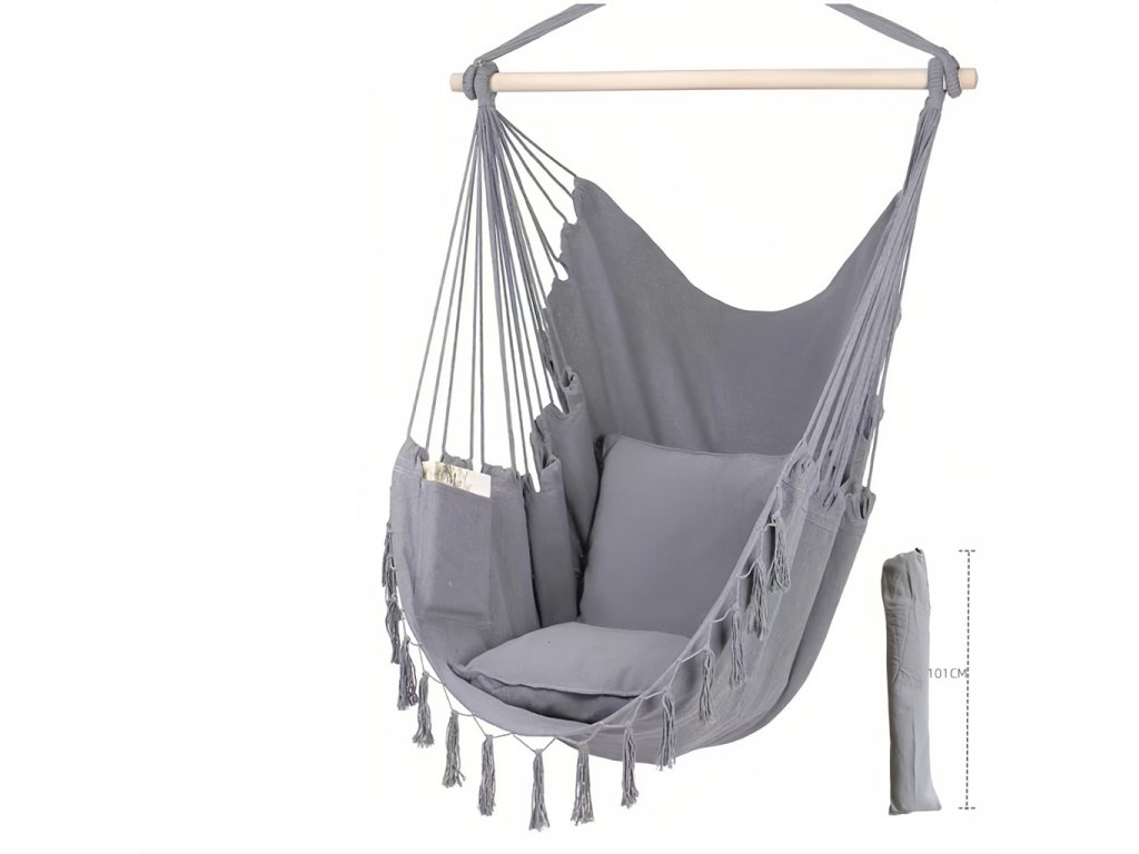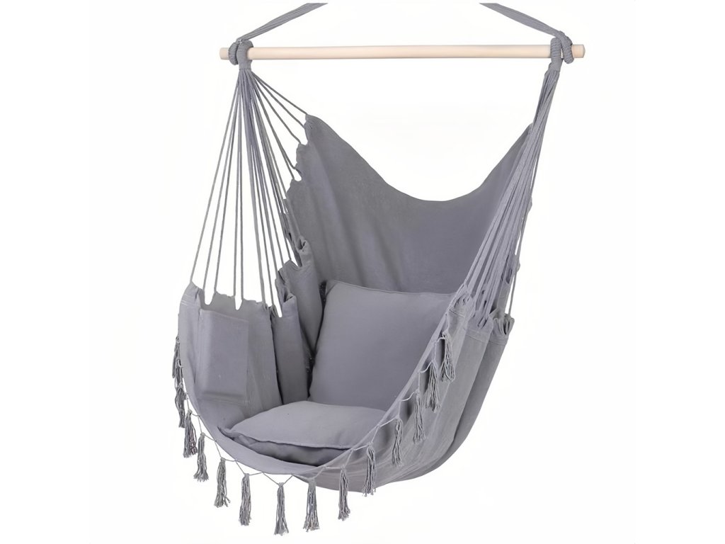 Pohodlí, relaxace a zábava! Závěsné houpací křeslo je ideálním místem pro relaxaci po náročném dni i pro klidné chvíle s oblíbenou knihou. Díky příjemnému bavlněnému materiálu nabízí maximální pohodlí a přirozeně se přizpůsobí tvaru těla. Jemné houpání navozuje pocit uvolnění a pohody, ať už ho umístíte na terasu, do zahrady, nebo do interiéru. Elegantní provedení a vzdušný design z něj dělají nejen pohodlný, ale i stylový doplněk, který dodá každému prostoru nádech útulnosti a lehkosti. Hlavní vlastnosti: vyrobeno ze 100% bavlnypohodlné a bezpečné místo pro odpočinekelegantní šedý designvhodné pro děti od 3 letnosnost 80 kg