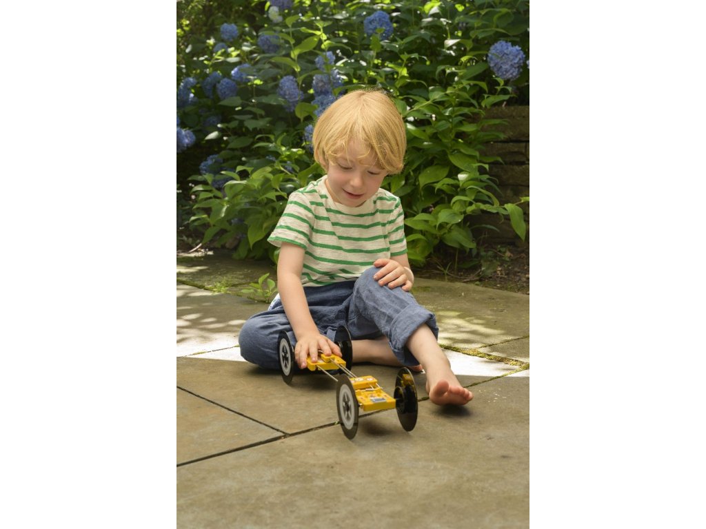Přeměna energie: Stavebnice učí děti, jak se potenciální energie (uložená v natažené pružině) přeměňuje na kinetickou energii (pohyb auta). Když se pružina uvolní, tahá za provázek, který otáčí nápravou, a tím pohání kola.
