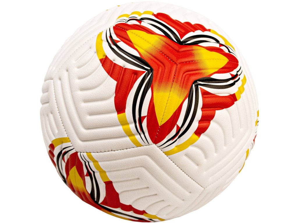 Dynamický Design: Míč se vyznačuje atraktivním bílým základem s výraznými grafickými prvky v kombinaci červené a žluté barvy. Tento moderní design zaručuje, že míč bude na hřišti dobře viditelný.