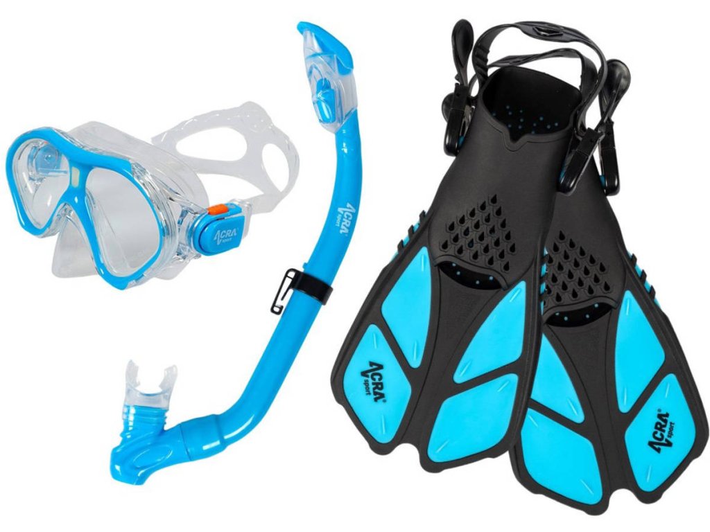 Dětská modrá sada na šnorchlování Acra sport, součástí nastavitelné dětské ploutve, suchý šnorchl, plavecká maska. 3in1.