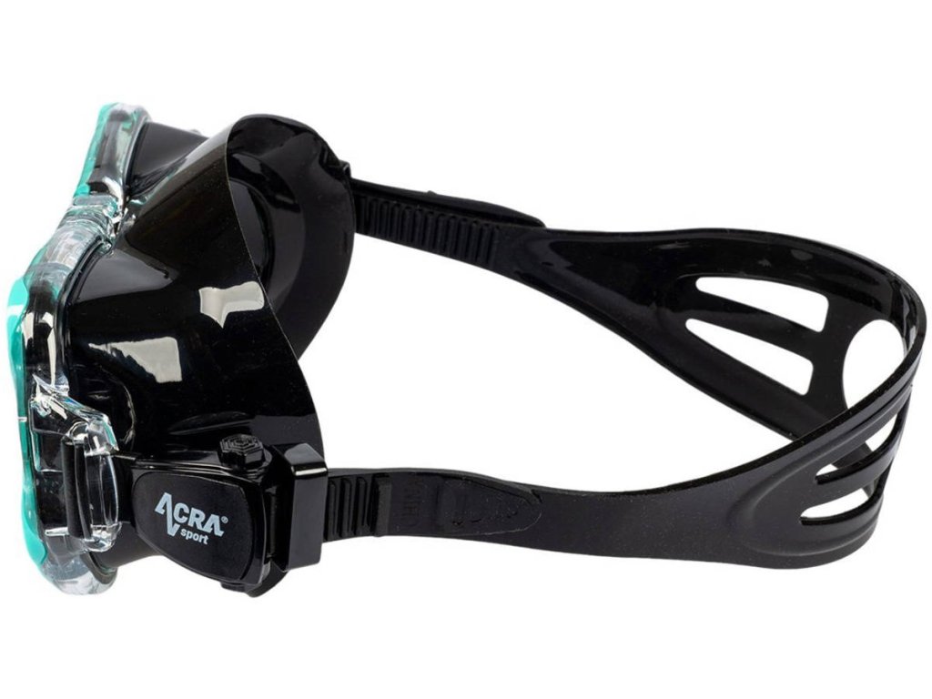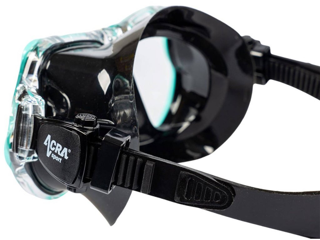 Potápěčská šnorchlovací maska s panoramatickým výhledem: 180° HD Panoramatický výhled s ANTIFOG upravou. Vyrobená ze čtyř okének pro panoramatický výhled s tvrzeným skleněným zorníkem a hypoalergenním silikonovým lemem, šnorchlovací maska Acra Sport odolá podvodnímu tlaku při potápění a šnorchlování a nabízí maximální pohodlí. Lem potápěčské masky je vyroben z měkkého a pružného silikonu a náustek z potravinářského silikonu je bezpečný, vytváří vodotěsné utěsnění s obličejem každého řidiče a dokonale se připevňuje k ústům bez zvláštního zápachu.