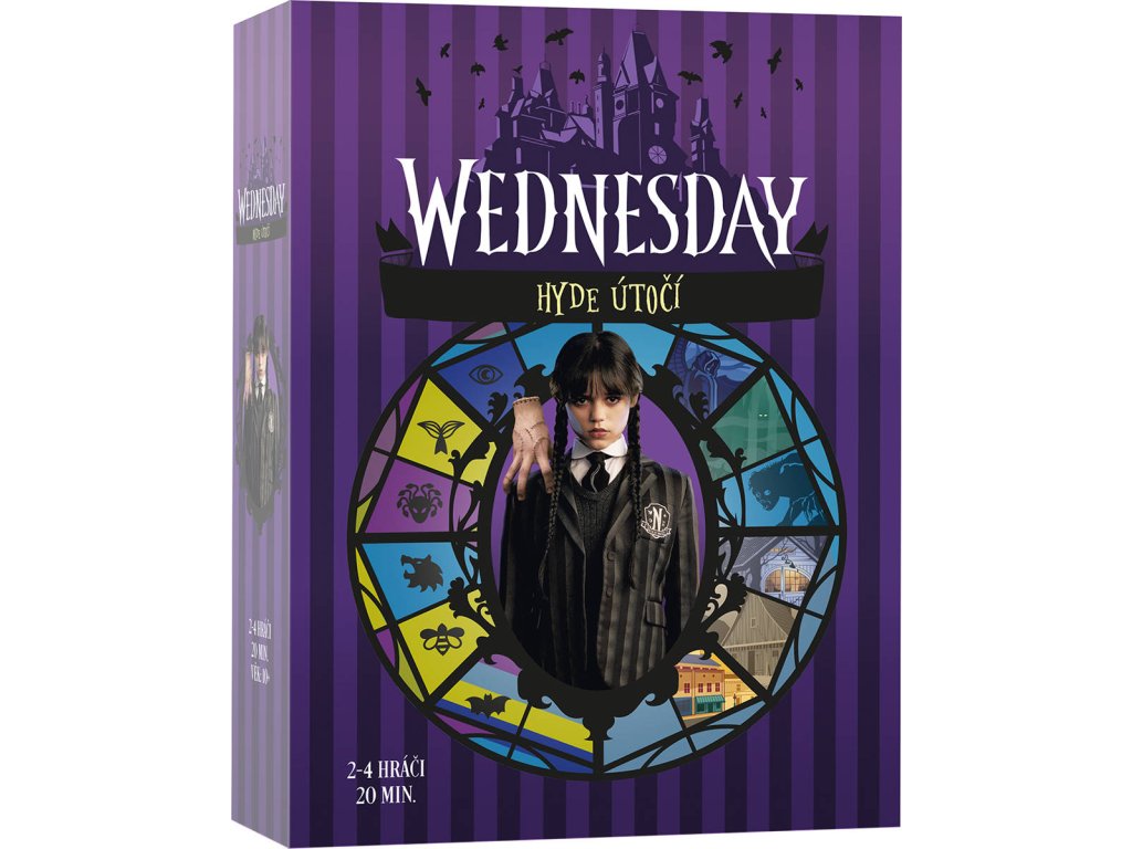 Společenská hra Wednesday: Hyde útočí. Kooperativní párty hra s licencí populárního seriálu. Akademii Nikdy víc hrozí nebezpečí a nastává chaos. Studenti se musí bránit!