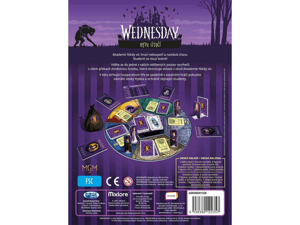 Společenská hra Wednesday: Hyde útočí. Kooperativní párty hra s licencí populárního seriálu. Akademii Nikdy víc hrozí nebezpečí a nastává chaos. Studenti se musí bránit!