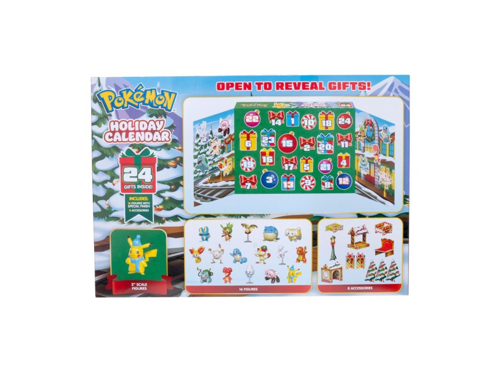Adventní kalendář s překvapením na 24 dnů! Perníková chaloupka jako tematický displej! Obsahuje 15 ks 6 cm vysokých figurek pokemonů. 1 x NOVÁ 6 cm figurka s vánočním motivem a se speciální povrchovou úpravou! 8 ks vánočních dopňků