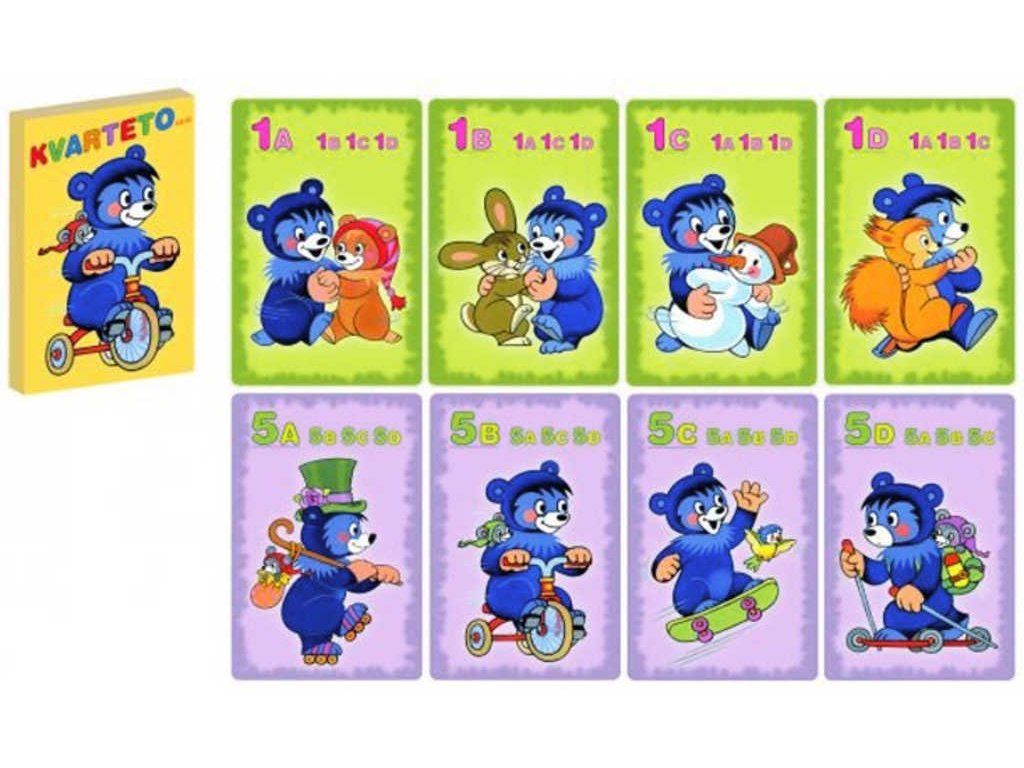 Dětské hrací karty pro hru kvarteto, s ilustracemi s motivem Medvídek Baribal. Baleno v papírové krabičce.
