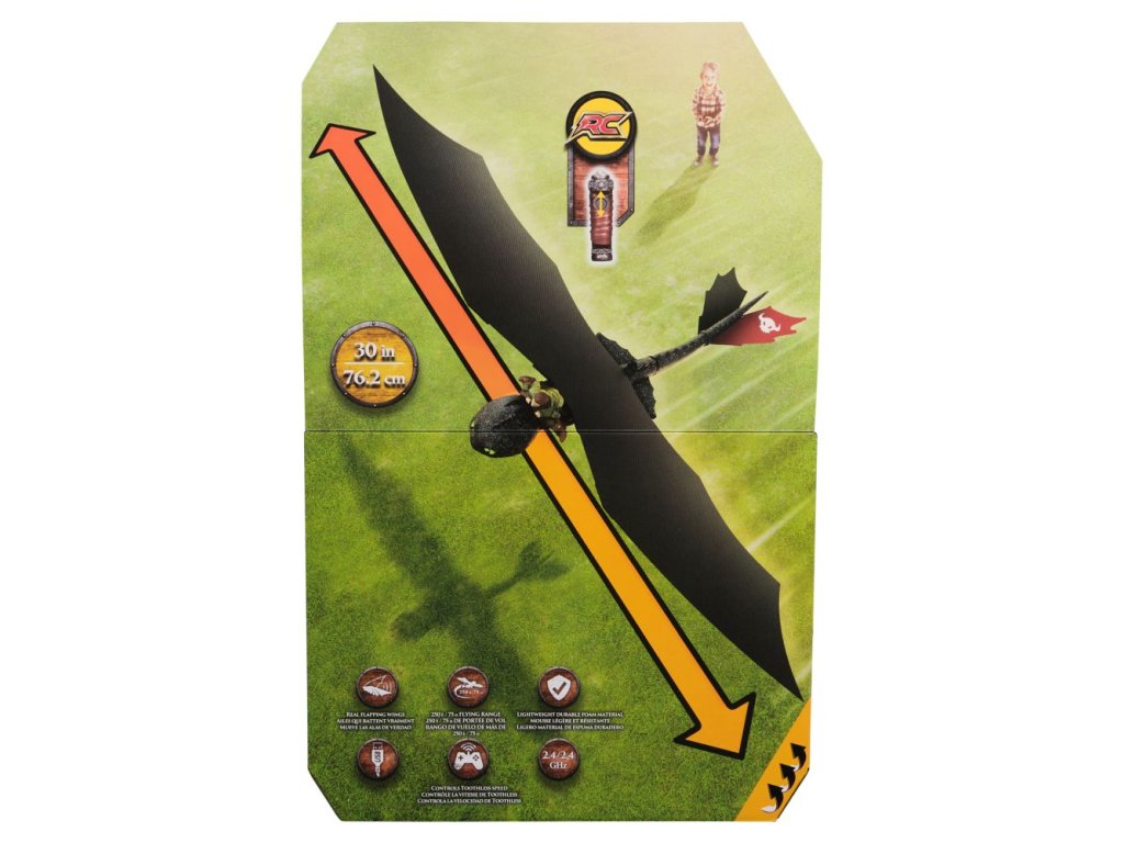 Létající drak Bezzubka na dálkové ovládání s figurkou Škyťáka. Vhote draka do vzduchu a ovladačem aktivujte letovou fázi. Drak začne mávat křídly a velmi realisticky letí. Ovladačem se kontroluje pouze výška. Směr letu se určí natočením jeho ocasu a podle toho opisuje velký nebo menší oblouk letu.