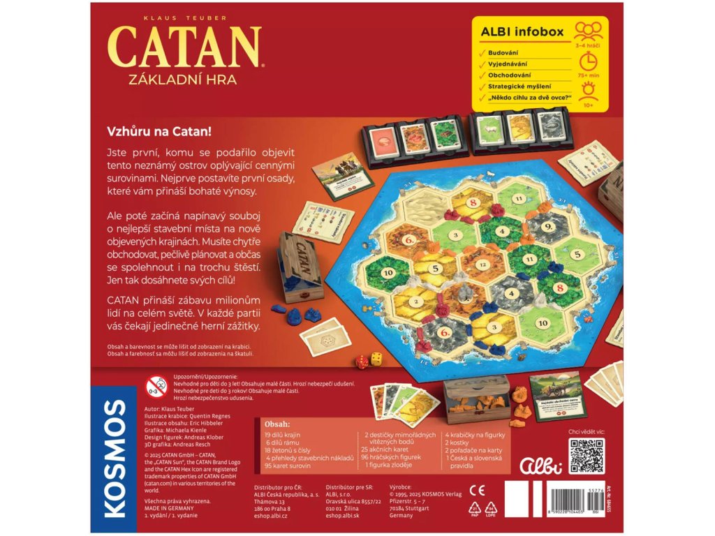 Osidlujte Catan v jeho nové, přepracované edici. Získávejte suroviny, obchodujte s protihráči a staňte se nejslavnějším osadníkem tím, že jako první postavíte deset vítězných bodů. V rodinné deskovce Catan - Základní hra je v roli prvních osadníků ostrova Catan na vás rozšířit své vesnice a města napříč neprobádanou krajinou. Vaším cílem je pomocí obchodu, těžby a budování získat vládu nad celým ostrovem. Vítězství ovšem vyžaduje šikovně obchodovat s ostatními hráči a pečlivě plánovat svou expanzi, protože některých surovin budete mít nadbytek a jiné vám budou chybět. Kamení za vlnu, obilí za dřevo. Dobře si rozmyslete, jaký bude váš další krok, postavte svoje vesnice na těch pravých místech a obchodujte tak chytře, jak jen dokážete.