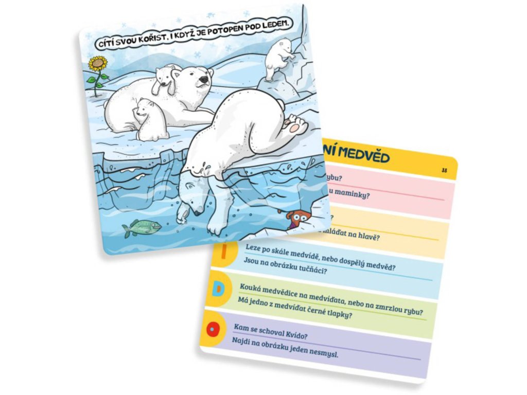 Balení obsahuje: 60 karet s obrázky i otázkami k danému tématu, 20 oboustranných bonusových karet pro Kvídovu paměťovku, 4 bodovací karty, 32 obrázkových žetonů pro bonusový úkol, 40