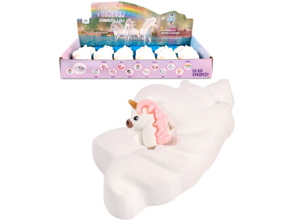 Sada Vykopej a objevuj - Jednorožci a víly obsahuje: 12 sádrových jednorožců s figurkami, 12 malých nástrojů.