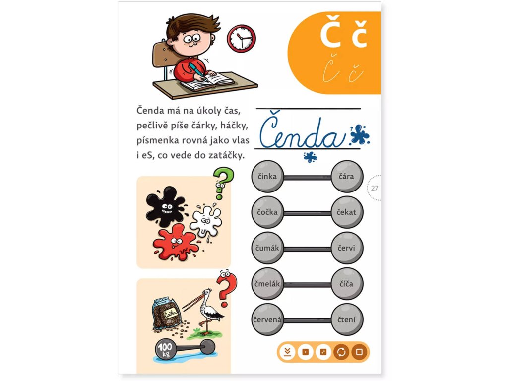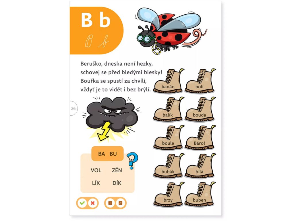 Každé z písmen české abecedy vidí děti ve všech tiskacích i psacích podobách. Jednotlivým samohláskám a souhláskám je věnován vždy ucelený blok zábavných úkolů, které podporují procvičení i upevnění výuky čtení. Děti od 6 let si postupně osvojí znalosti všech písmen a následně jsou schopné číst slova různých obtížností. Díky elektronické tužce se mohou učit interaktivně a naposlouchat správnou intonaci. Učebnice je vhodná také pro domácí vzdělávání a zábavné procvičování čtení. Kniha obsahuje přes 3 000 zvukových stop.