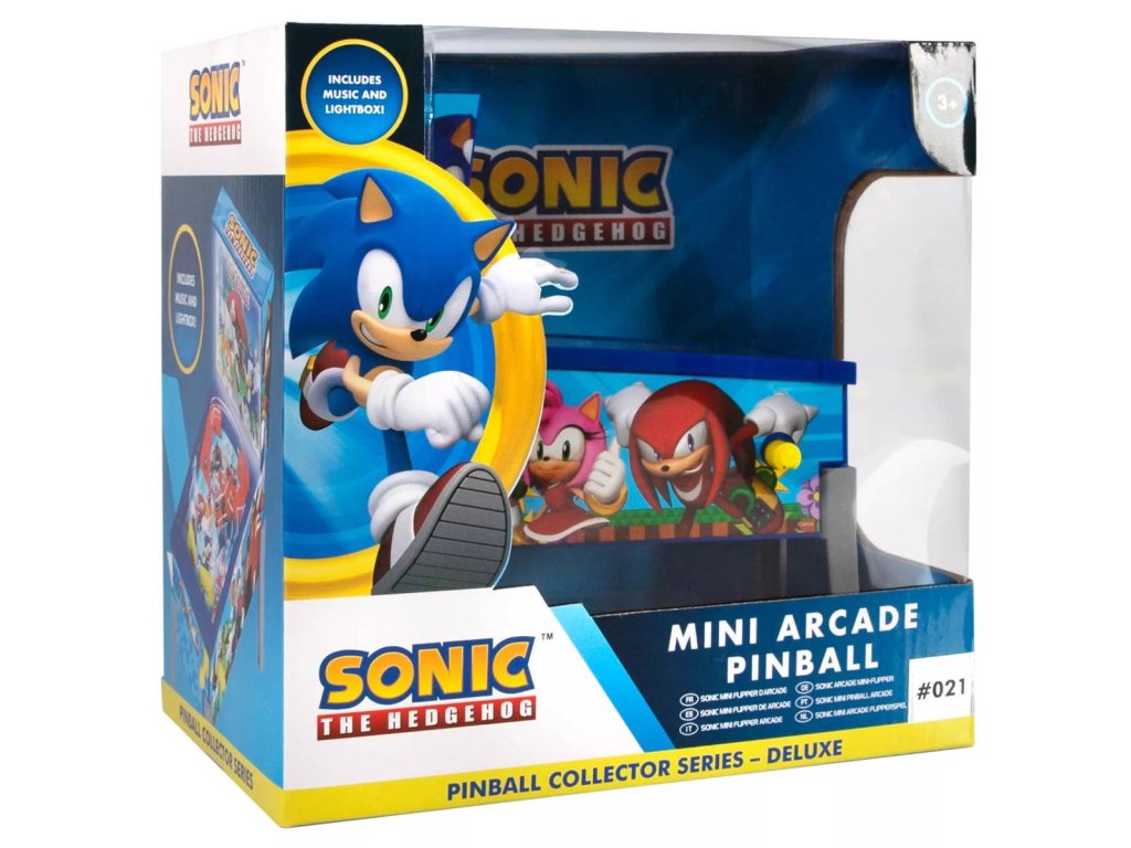 Hra Mini Arcade Pinball - Sonic obsahuje: kompaktní pinballovou plochu s bumpery, elektronické skóre s velkým LED displejem a automatickým detekováním ztracené koule, výrazné barevné LED osvětlení a zvukové efekty, koule pro pinball, návod v českém a slovenském jazyce.
