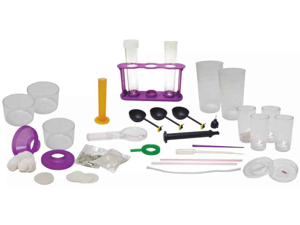 Balení obsahuje: 4 plastové trubice, 1 plastový trychtýř, 1 plastový kryt, 1 plastový kelímek, 1 sáček oblázků, 1 sáček mramorových kamínků, 3 filtrační papíry, 1 houbičku, 2 zkumavky, 1 zátku s otvorem, 1 stojan na zkumavky, 2 brčka, 1 odměrný válec s otvory, 1 Petriho misku, 1 kompas do vody, 3 větrné lopatky ve tvaru košíčku, 1 držák větrných lopatek, 1 madlo větrných lopatek, 2 plastové kelímky, 2 odměrky, 1 pipetu, 1 bavlněný provázek, 1 lupu, 3 vatové kuličky, 1 bublifukovou hůlku, 1 míchací tyčinku, návod