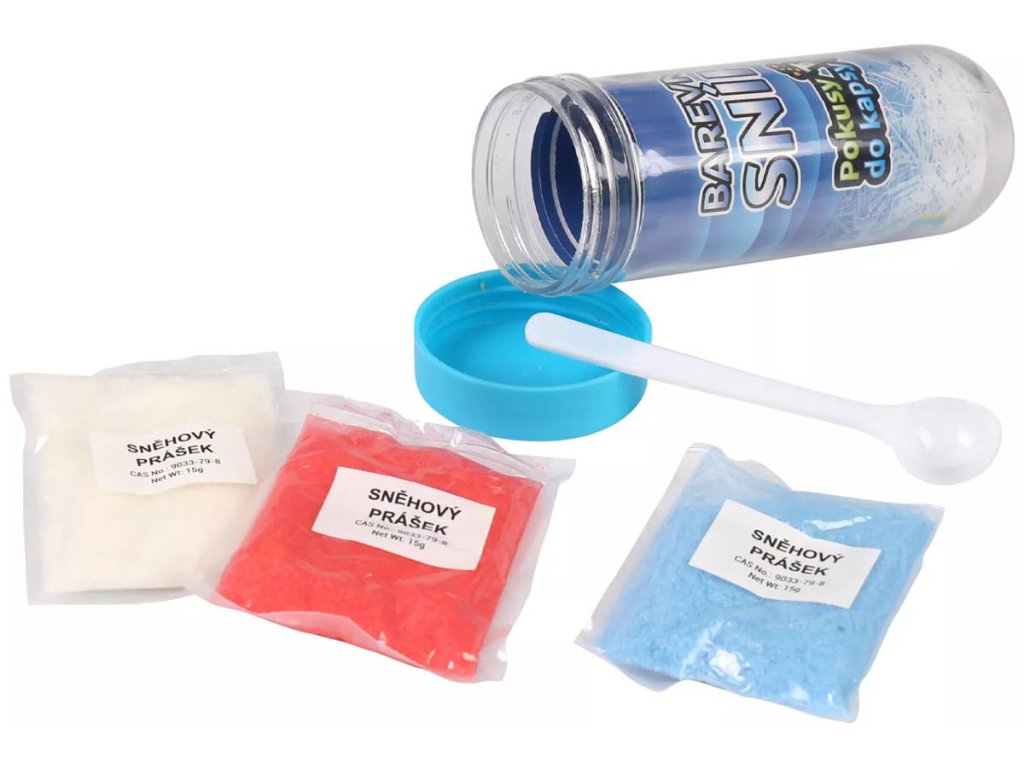 Pokusy do kapsy: Barevný sníh - Dětský experimentální vědecký set z produtové řady ALBI Science.