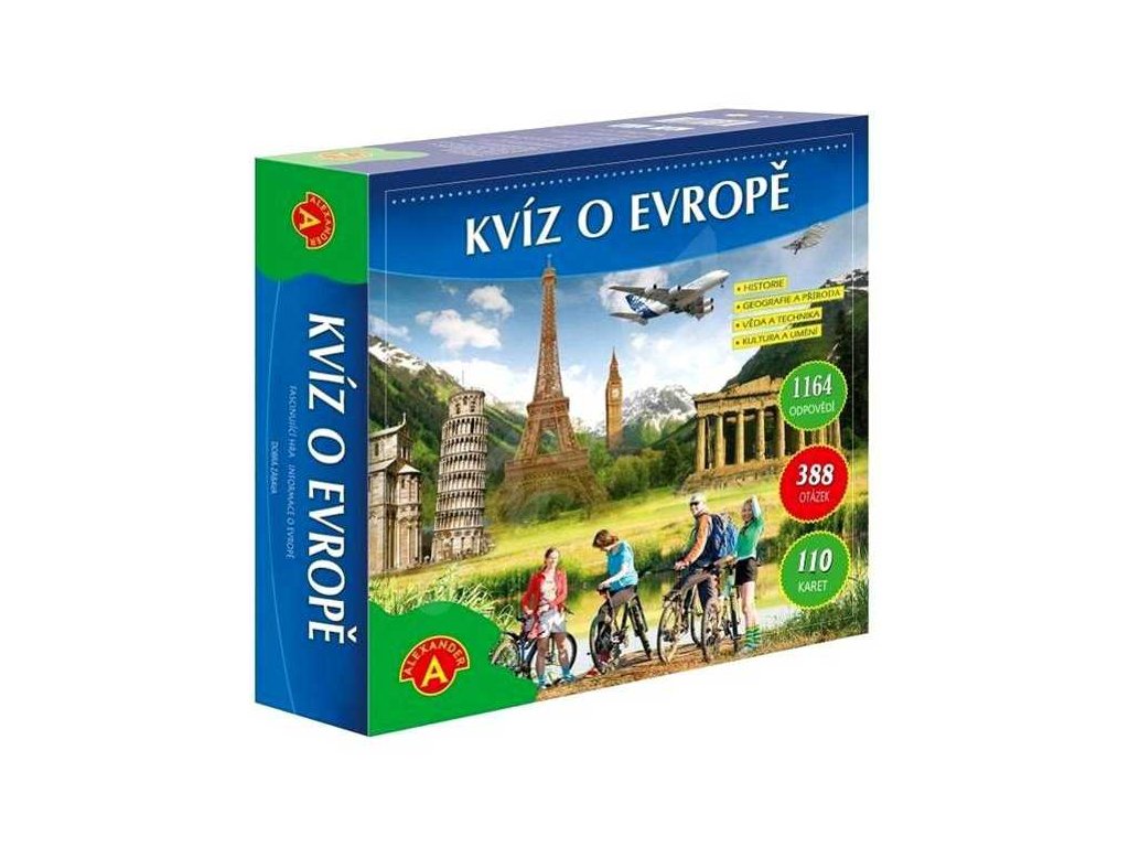 Zábavná vzdělávací hra Kvíz o Evropě Vám umožní procvičit si své znalosti a získat spoustu zajímavých informací. Ve hře najdete celkem 388 poutavých otázek z oblasti historie, geografie, přírody, vědy, techniky, kultury a umění. Vyhrává ten, kdo správně zodpoví nejvyšší počet otázek. Tuto napínavou hru mohou hrát 2 – 3 hráči starší 10 let.