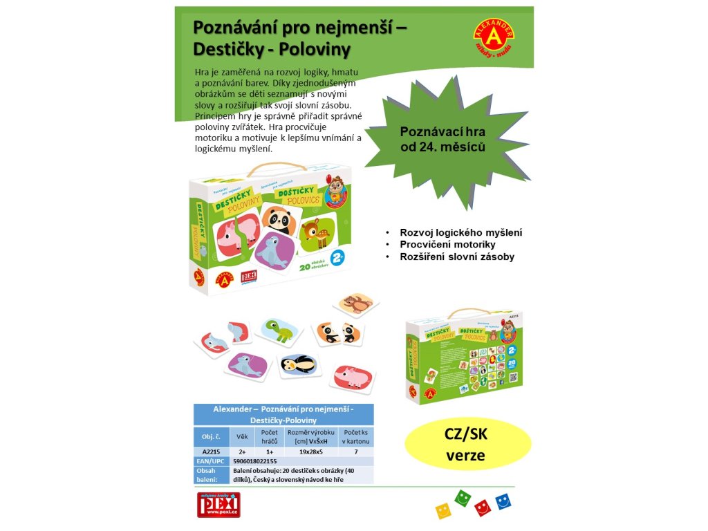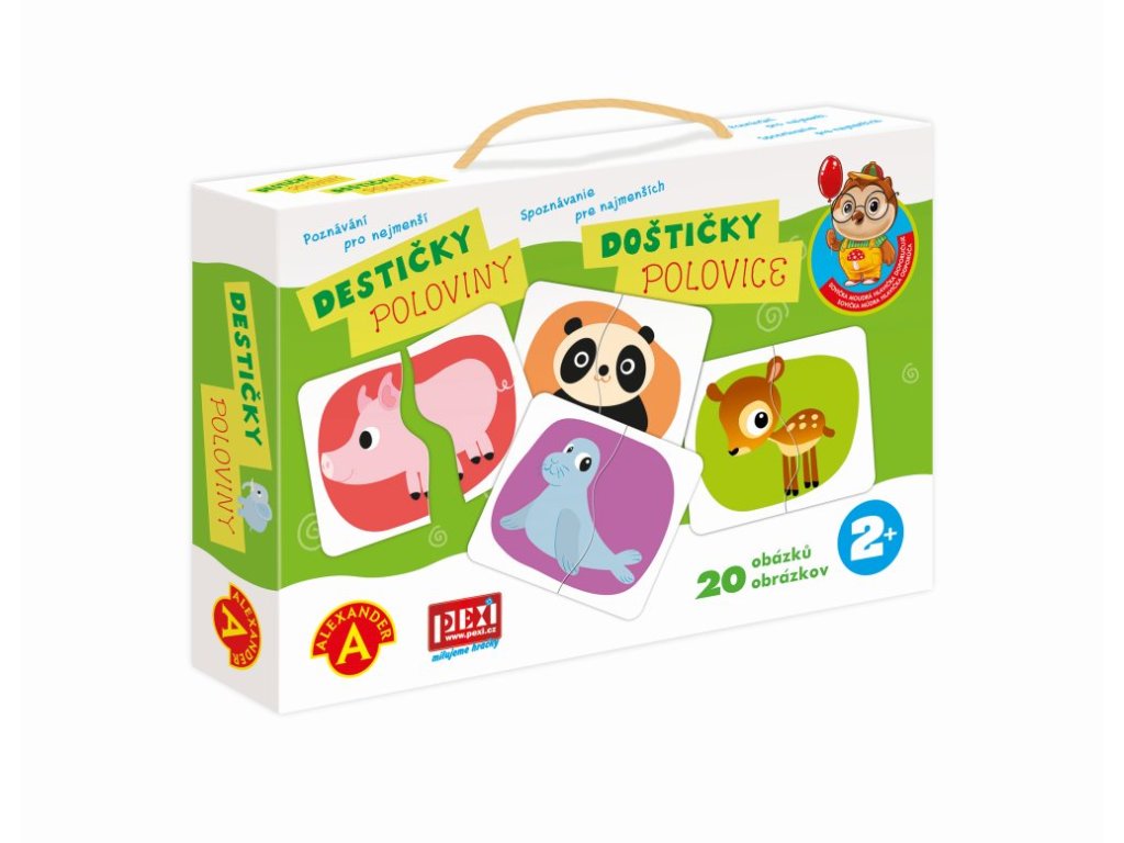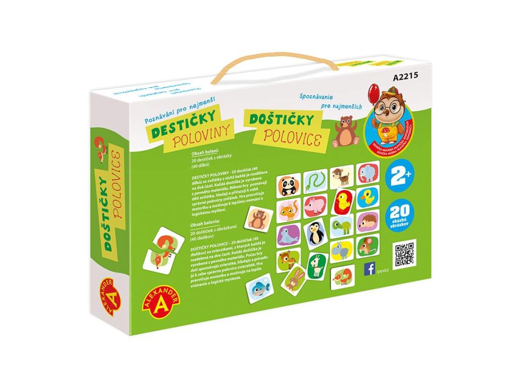 Jednoduchá, poznávací a naučná hra, která rozvíjí schopnosti dětí. Hra ze série "Sovička moudrá hlavička". Hra je zaměřená na rozvoj logiky, hmatu a poznávání barev. Díky zjednodušeným obrázkům se děti seznamují s novými slovy a rozšiřují si tak slovní zásobu. Principem hry je správně přiřadit správné poloviny zvířátek. Hra procvičuje motoriku a motivuje k lepšímu vnímání a logickému myšlení. Garantem poznávacích her je uznávaná psycholožka z varšavské univerzity Alexandra Petrovská. Hra je vhodná pro děti od 2 do 3 let. Obsah balení: 20 destiček s obrázky z pevného kartonu (40 dílků), Český a slovenský návod ke hře, pevnou krabici s uchem pro snadné přenášení. Hlavní vlastnosti: pevná krabice s uchem pro snadné přenášenímotivuje k lepšímu vnímání a logickému myšlenírozvoj motoriky a poznávání barevrozšíření slovní zásoby