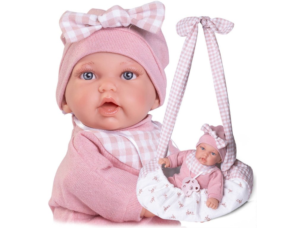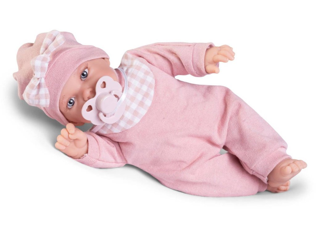 Ručně vyrobená realistická španělská panenka s měkkým látkovým tělem. Hlava a končetiny jsou vyrobené z kvalitního měkčeného vinylu. Panenka nemá vlásky a má modré nemrkací oči. Panenka má v sobě strojek,díky kterému po zmáčknutí vydává zvuky. Panenka je oblečena do růžového pyžámka-overalu a růžové čepičky s růžovo-bílou kostkovanou mašličkou. K panence patří přenosný vak ve stejných barvách jako je oblečení.
