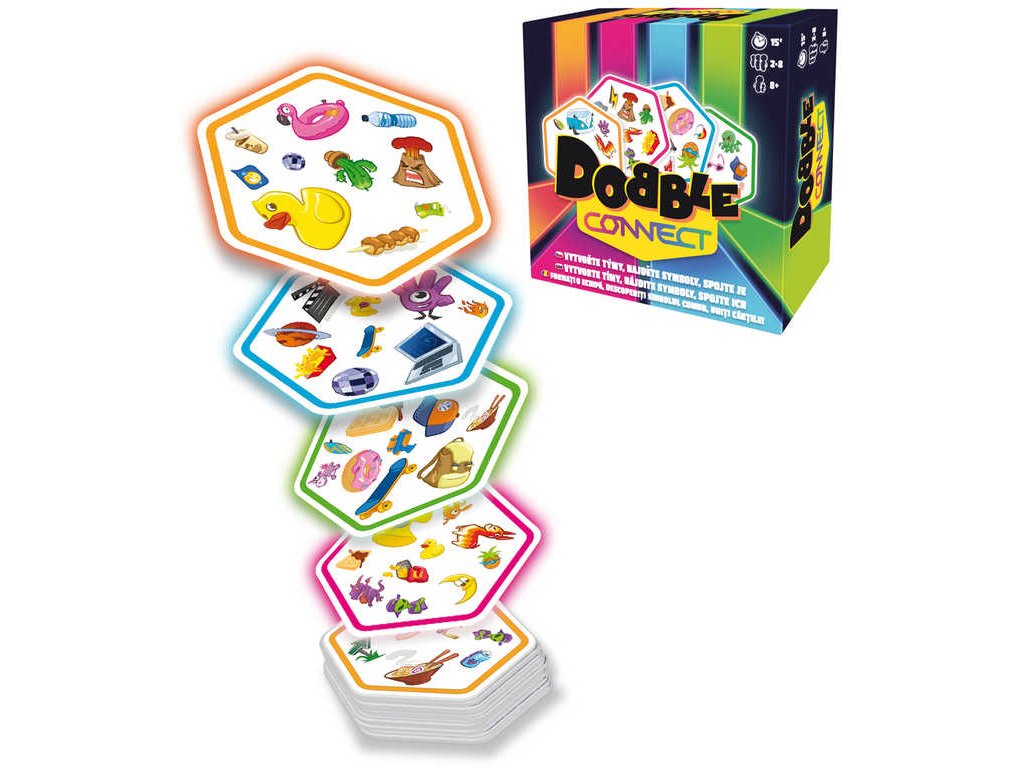 Dobble Connect je vizuálně netradiční podoba hry Dobble. Kartičky nejsou kulaté, nýbrž hexové, neboť je k sobě budete přikládat a pokusíte se tak vytvořit souvislou řadu čtyř karet své barvy. Do postřehové hry se tak vkrádá trocha strategie - ostatní vám v tom budou samozřejmě bránit.