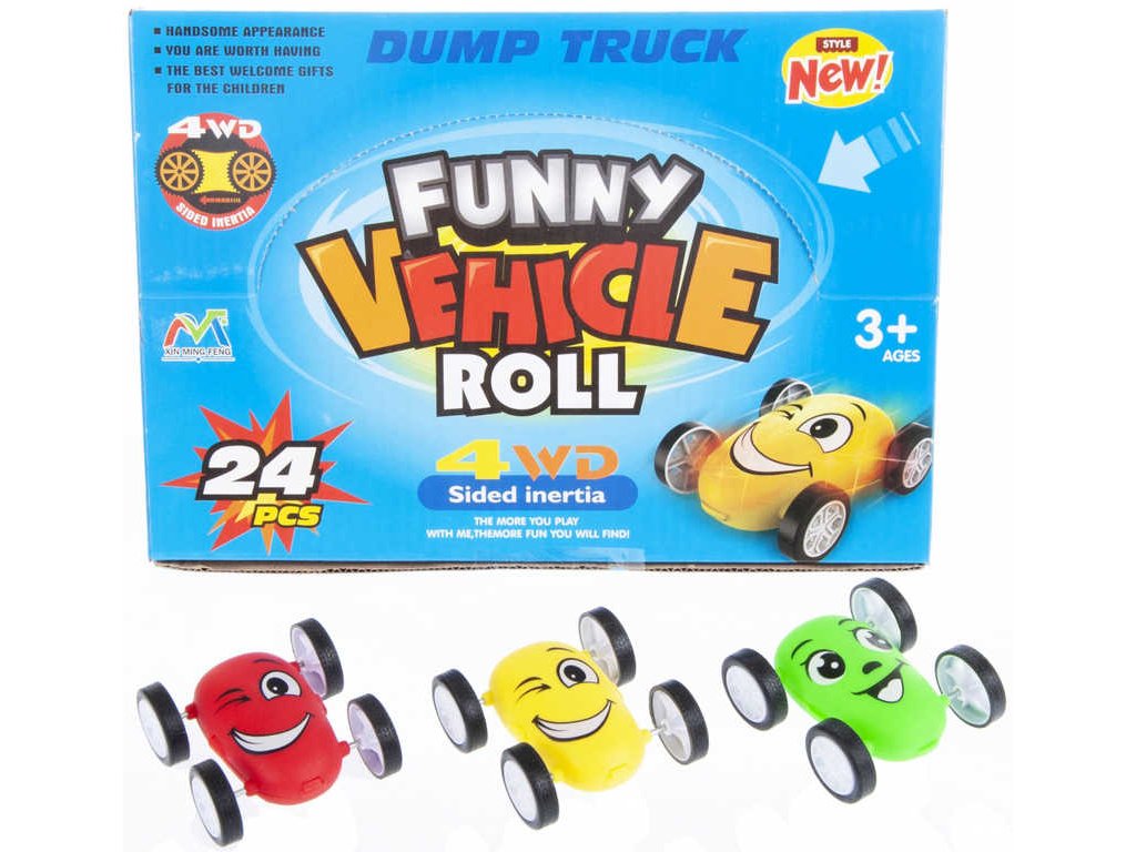 Legrační, barevné oboustranné autko z lehkého plastu, s obličejem, ve třech barevných variantách. Obracecí auto s pohonem na setrvačník, s pogumovanými kolečky. Srandovní autíčko formule pro ty