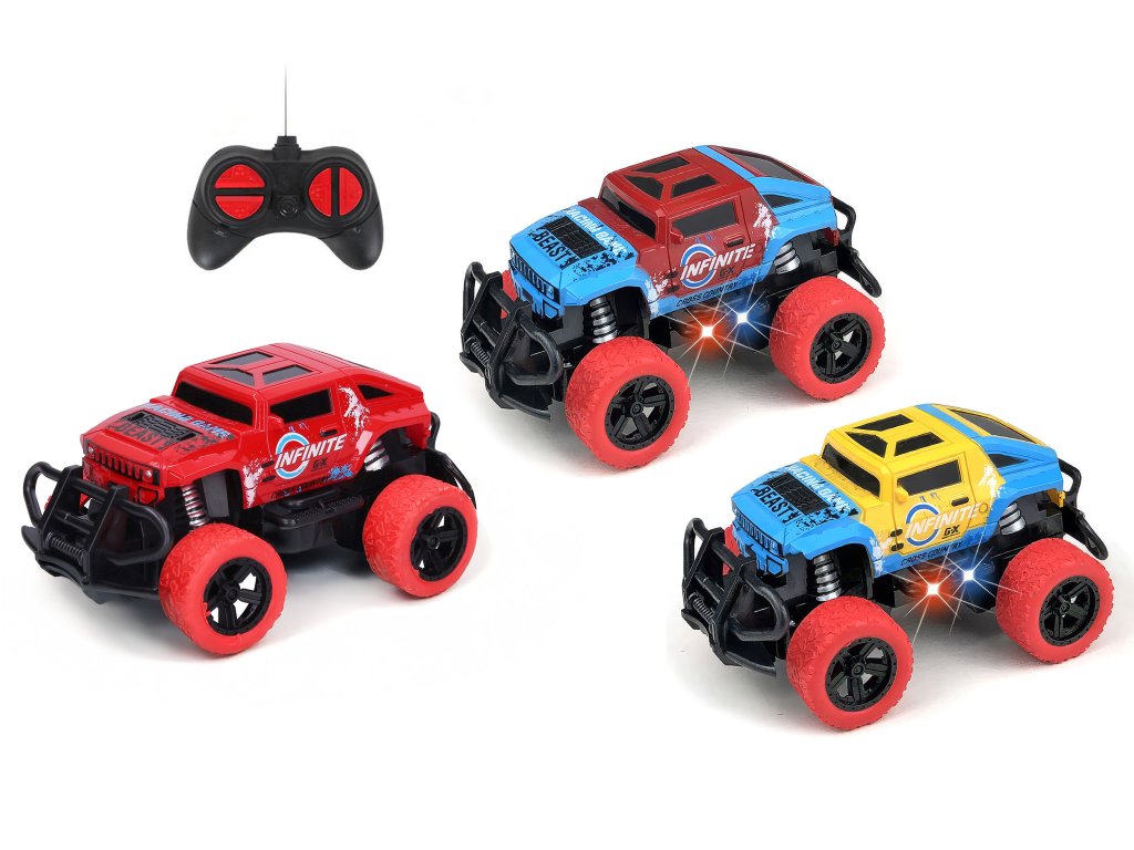 Auto Beast RC na dálkové ovládání. Rozměry 14,5x9x8 cm. Frekvence 27MHz. Světelné efekty. 2xAA baterie do auta a 2xAA baterie do ovladače nejsou součástí balení. Přepínač ON/OFF na spodní straně auta. 3 barevné varianty - modro žluté, modro červené. červené.
