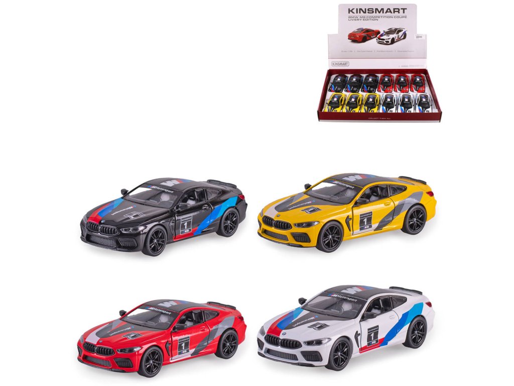 KINSMART KT5425: BMW M8 Competition Coupe Livery Edition - Věrný kovový model auta (detailní kopie) z kovu a plastu, zpětný chod, 4 barvy. Má otevírací dveře (dvířka jdou otevírat). Auto vyrobeno tlakovým litím z kovové slitiny v kombinaci s plastovými díly.