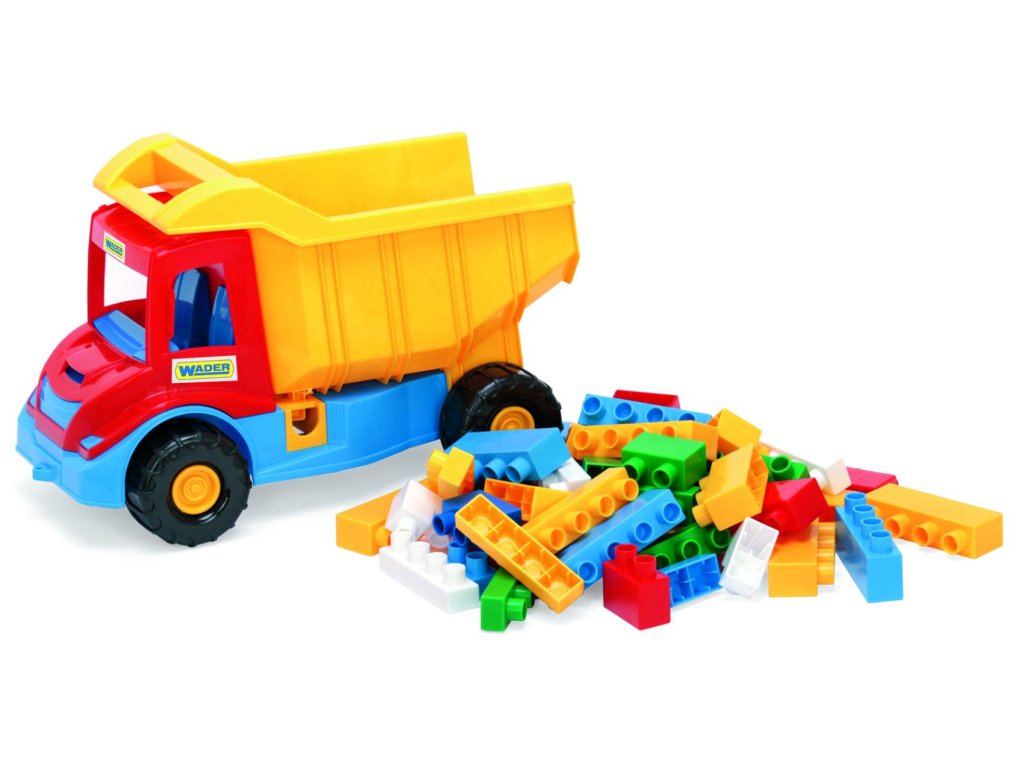Barevný nákladní vůz z kvalitního plastu veze na své sklopné korbě hromadu různých stavebních dílků, ze kterých si děti mohou postavit stavby podle vlastní fantazie. Vhodné od 12 měsíců.
