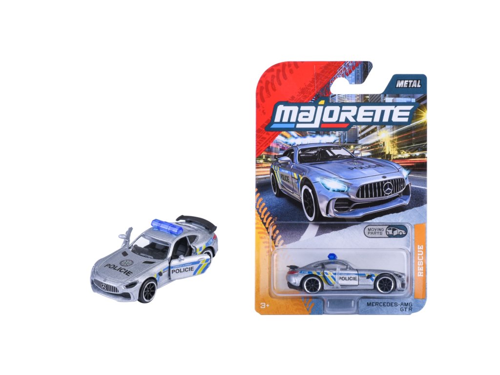 Kovové policejní auto Mercedes AMG GT-R na volnoběh. Pohyblivé a/nebo otevírací část. Délka 7,5 cm.