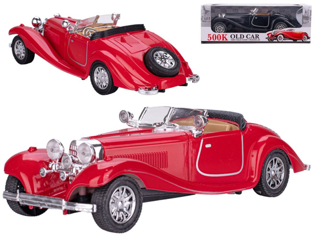 Retro červené plastové auto veterán Old Timer ve dvou barevných variantách, s pohonem na setrvačník. Velikost 25cm.