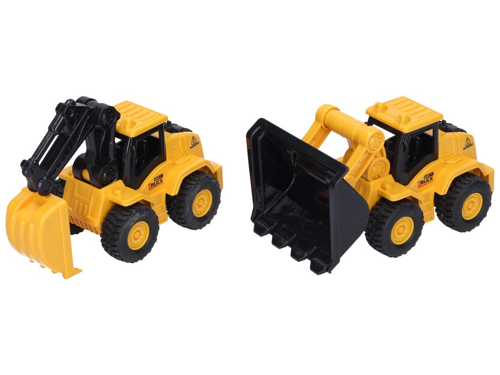 Auto stavební stroje. Velikost 17 cm. Stroje mají pohyblivá ramena a lžíce. Pohon na setrvačník. 2 varianty - bagr, buldozer. Display box 10 ks