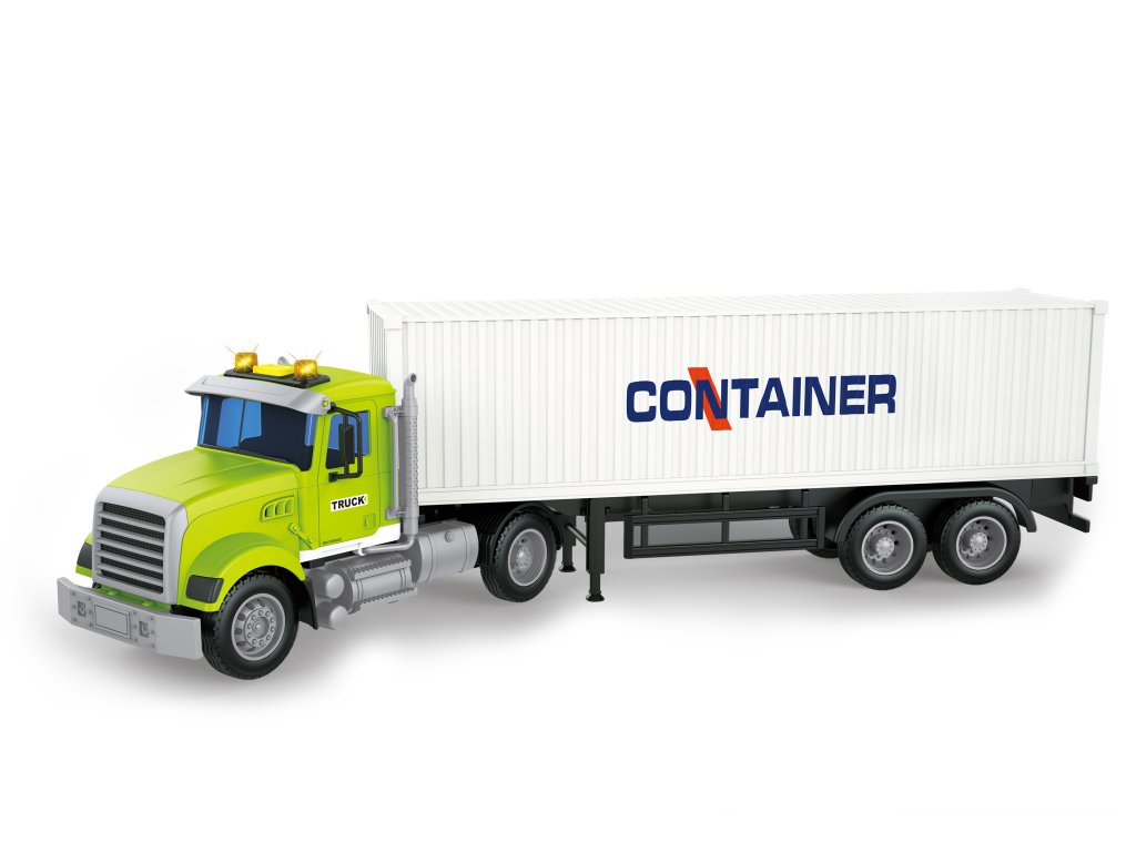 Auto tahač s kontejnerem na setrvačník s efekty. Velikost 48x9,5x14 cm. Vydává světelné a zvukové efekty. Aktivace tlačítkem na střeše. Opakovaný stisk přepíná efekty - zvuk motoru, zvuk sklápění, zvuk couvání, zvuk troubení. Baterie 3xAG13, součástí (1,5V). Otevíratelné dveře kontejneru, na setrvačník. Návěs je možné odpojit.