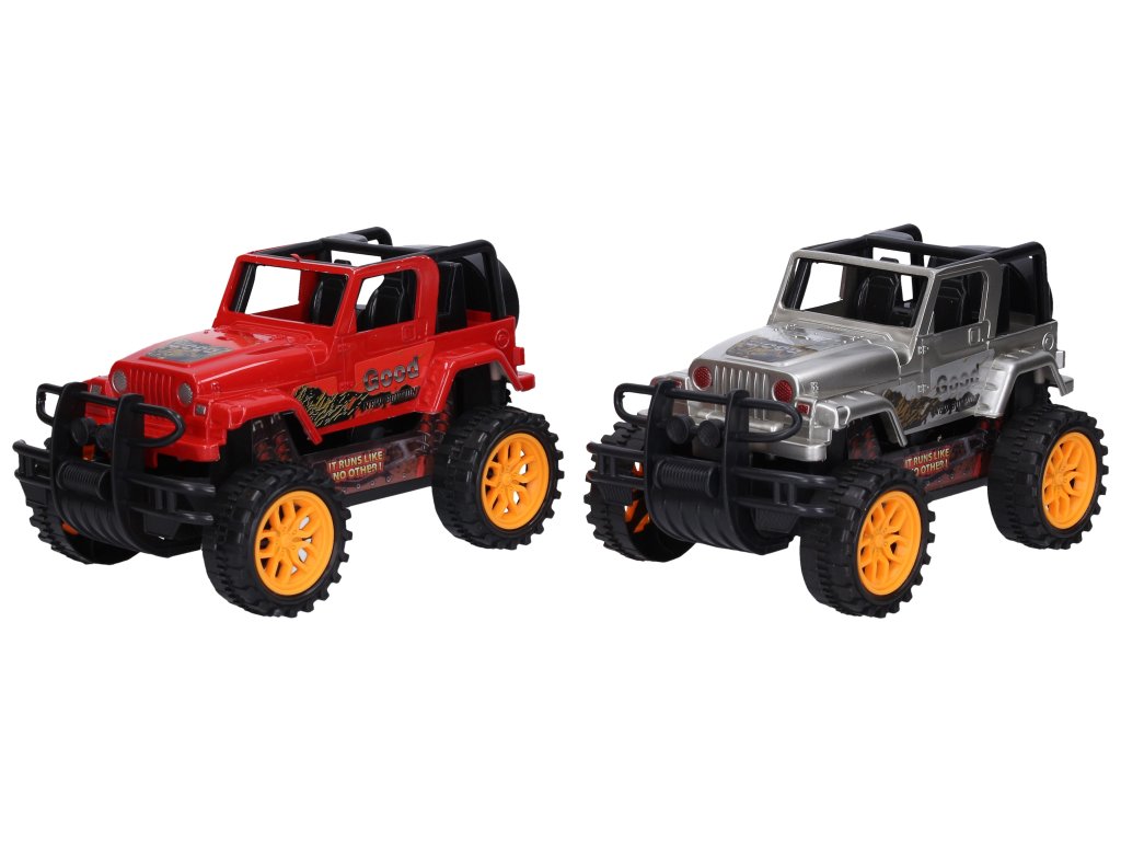 Auto terénní. Rozměry 20x12x11 cm. Na setrvačník. 2 varianty - stříbrná, červená.