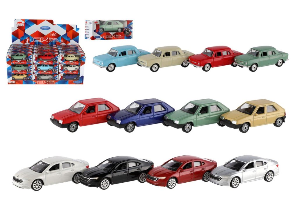 Auto Welly Škoda 1:60 kov/plast 7cm mix druhů na volný chod v krabičce 10x4x4cm 36ks v boxu