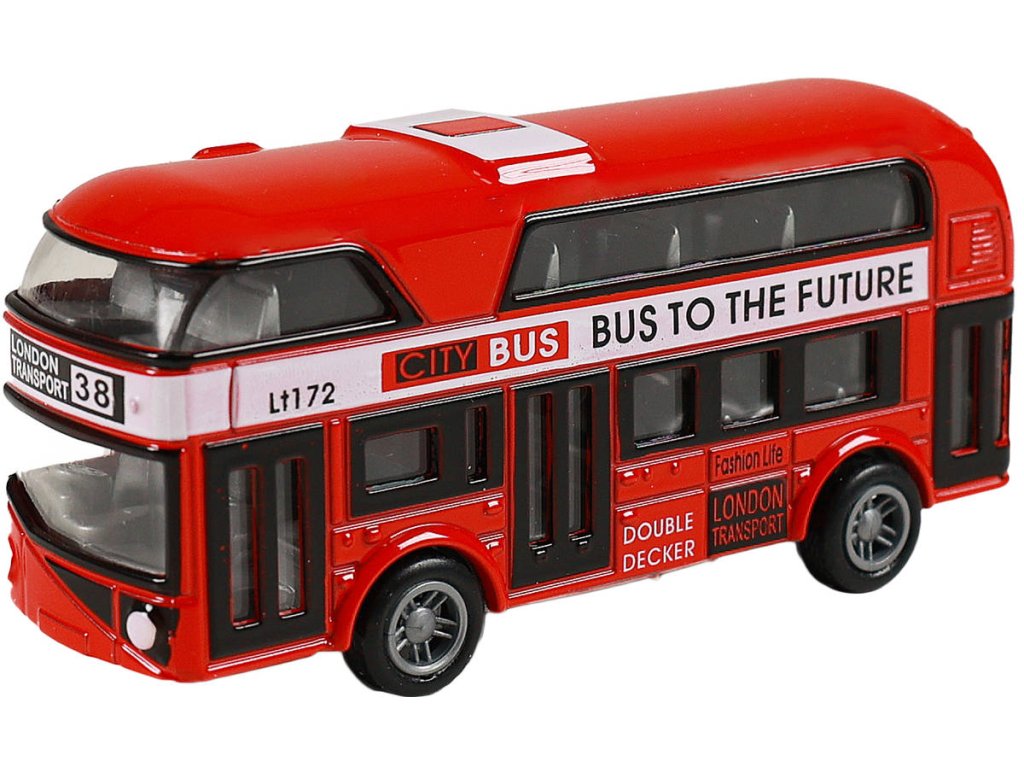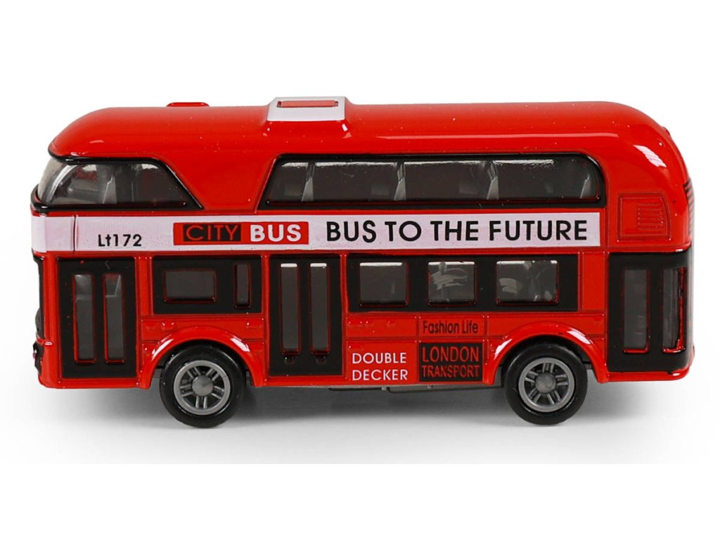 Autobus dvoupatrový, typický červený londýnský double decker je kovový a jezdí na zpětný chod. Délka cca 9,5cm. Městská hromadná doprava.