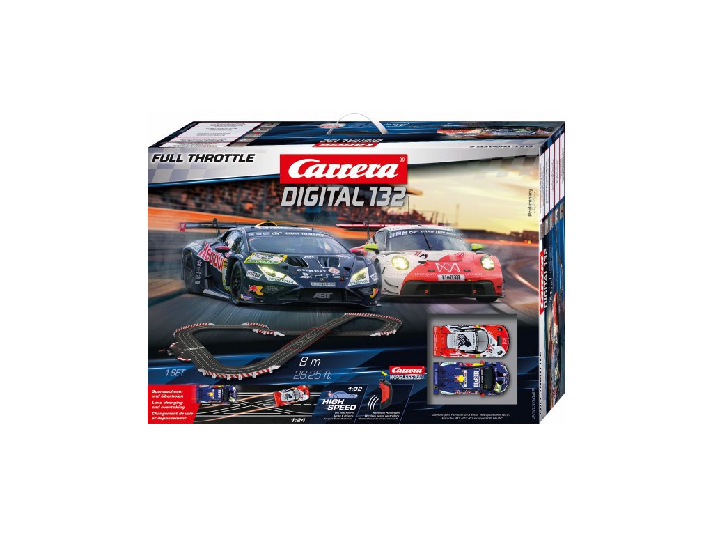 Autodráha Carrera Digital 132 dlouhá 8m s auty GT3 Lamborghini Huracán a Porsche 911 obsahuje rovinky, zatáčky, bezdrátové ovladače, přemostění, díl na předjíždění zleva a zprava, napájecí díl a další díly.