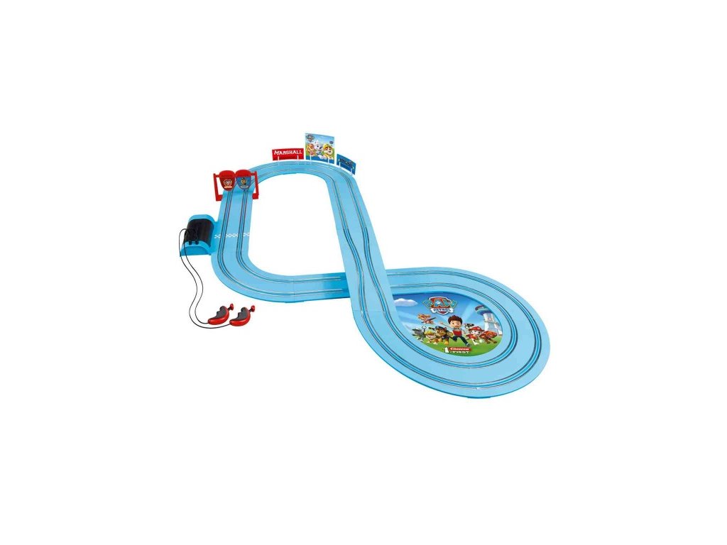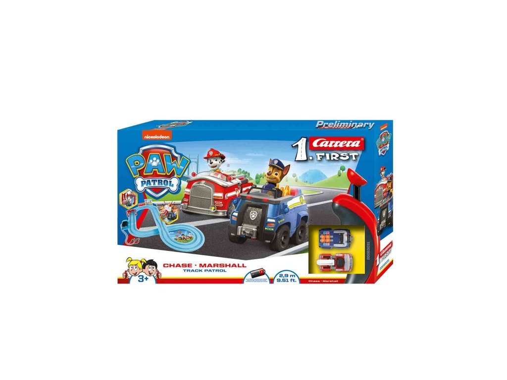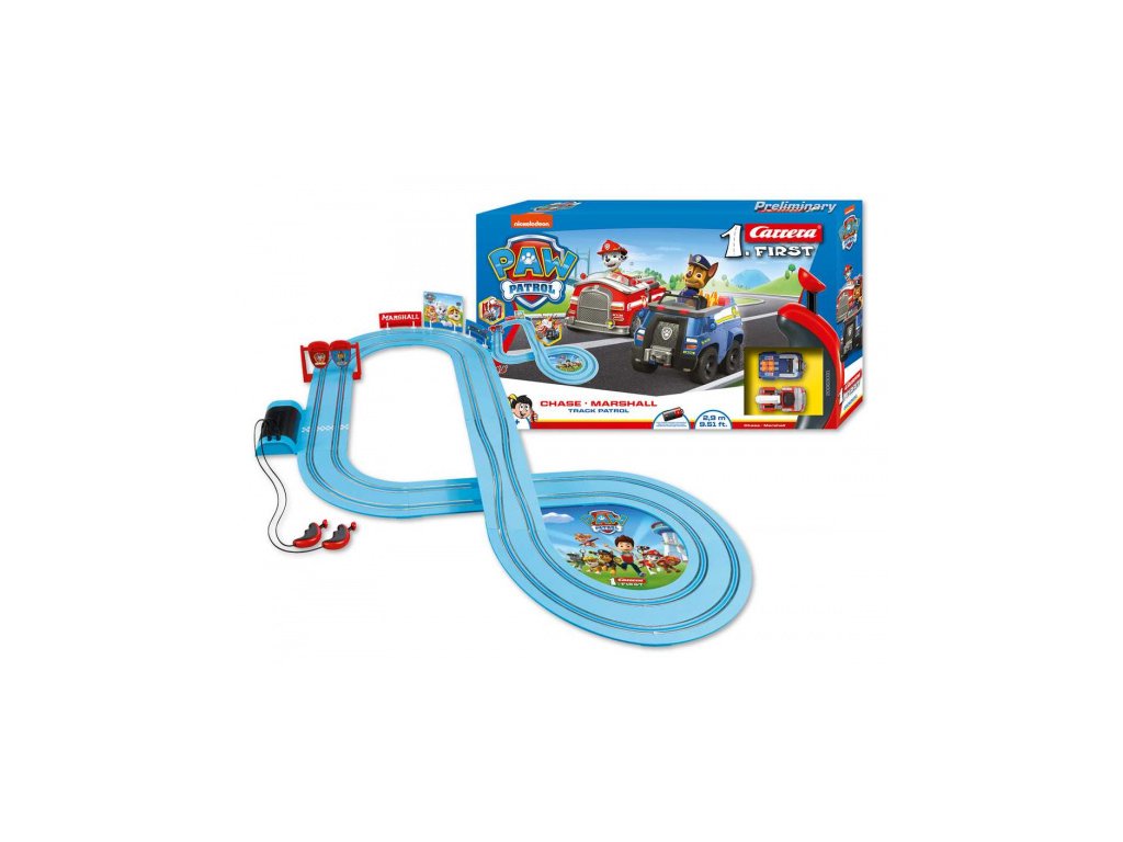 Autodráha Carrera FIRST dlouhá 2,9m s auty ze seriálu Tlapková patrola, pro děti od 3 let, na baterie, obsahuje rovinky, zúžení dráhy pro možné srážky, zatáčky, točíčí bránu, ovladače a dekorace s tématikou Tlapková patrola.