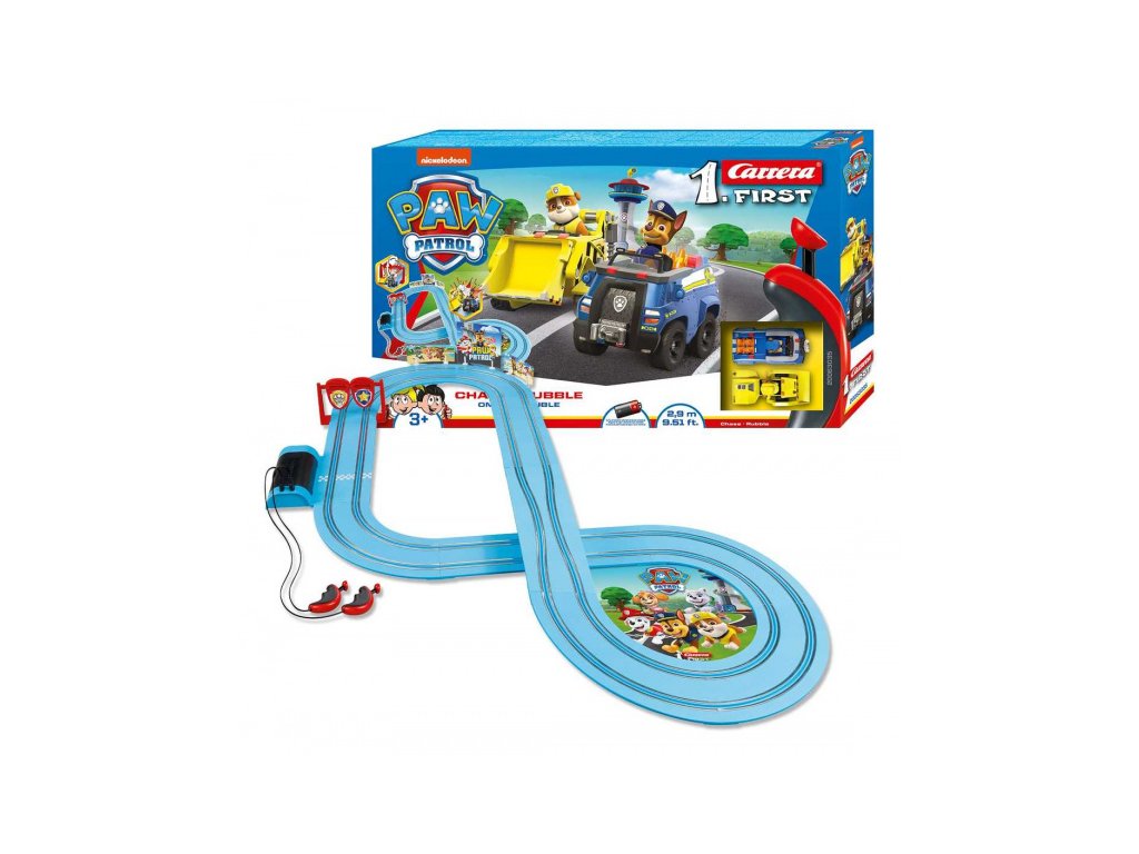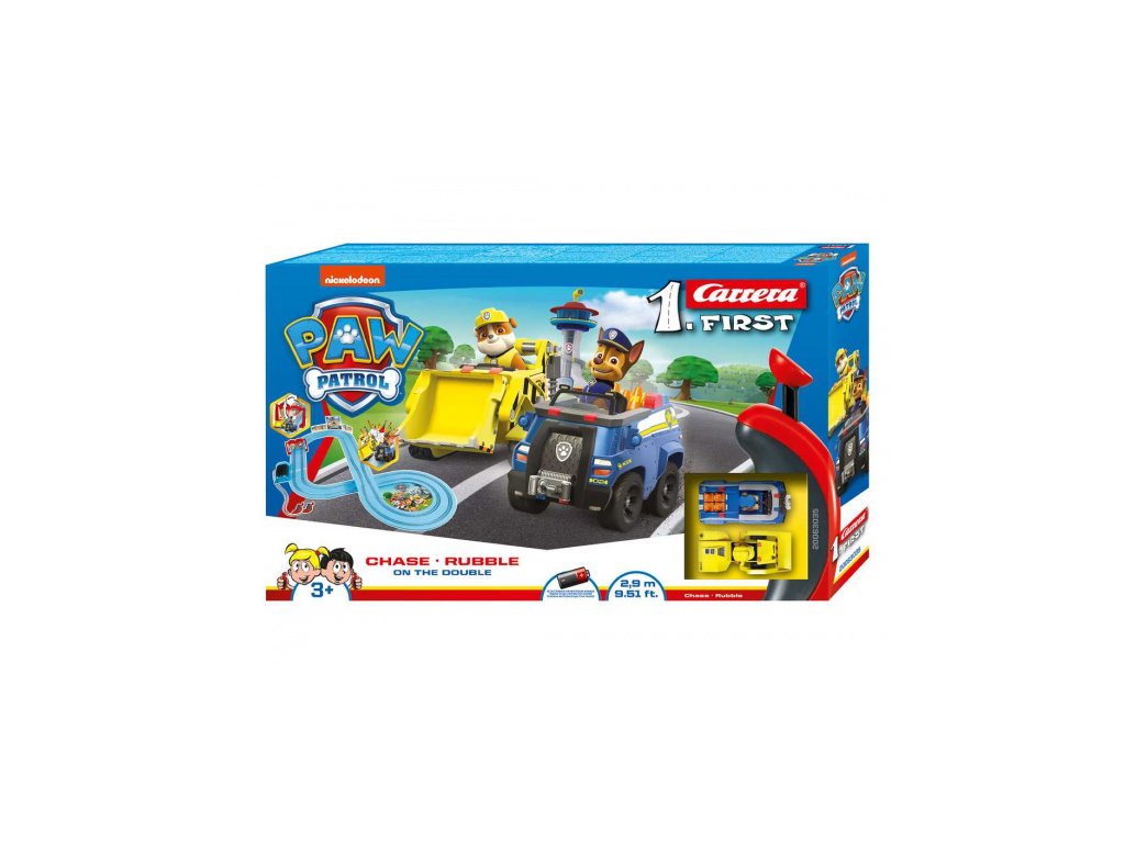 Autodráha Carrera FIRST dlouhá 2,9m s auty ze seriálu Tlapková patrola, pro děti od 3 let, na baterie, obsahuje rovinky, zatáčky, zúžení dráhy pro možné srážky, točící brána, ovladače a dekorace s tématikou Paw Patrol.