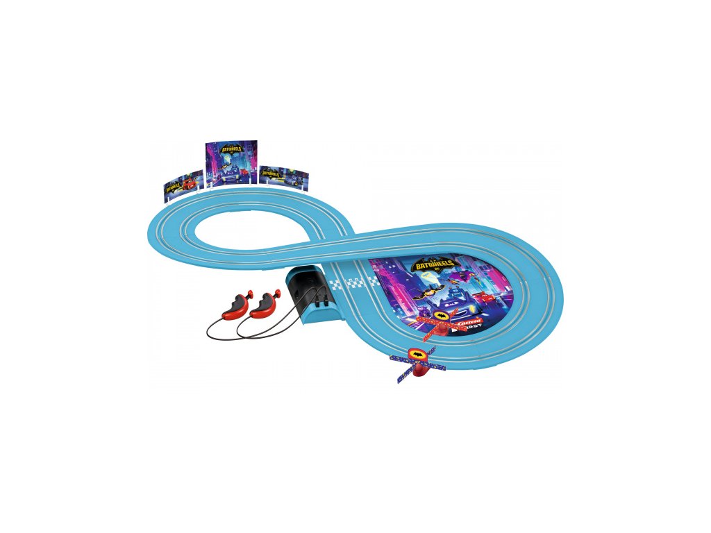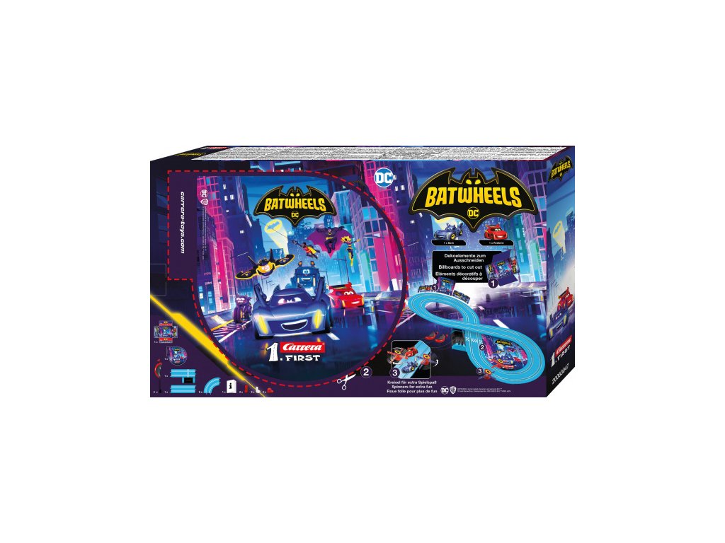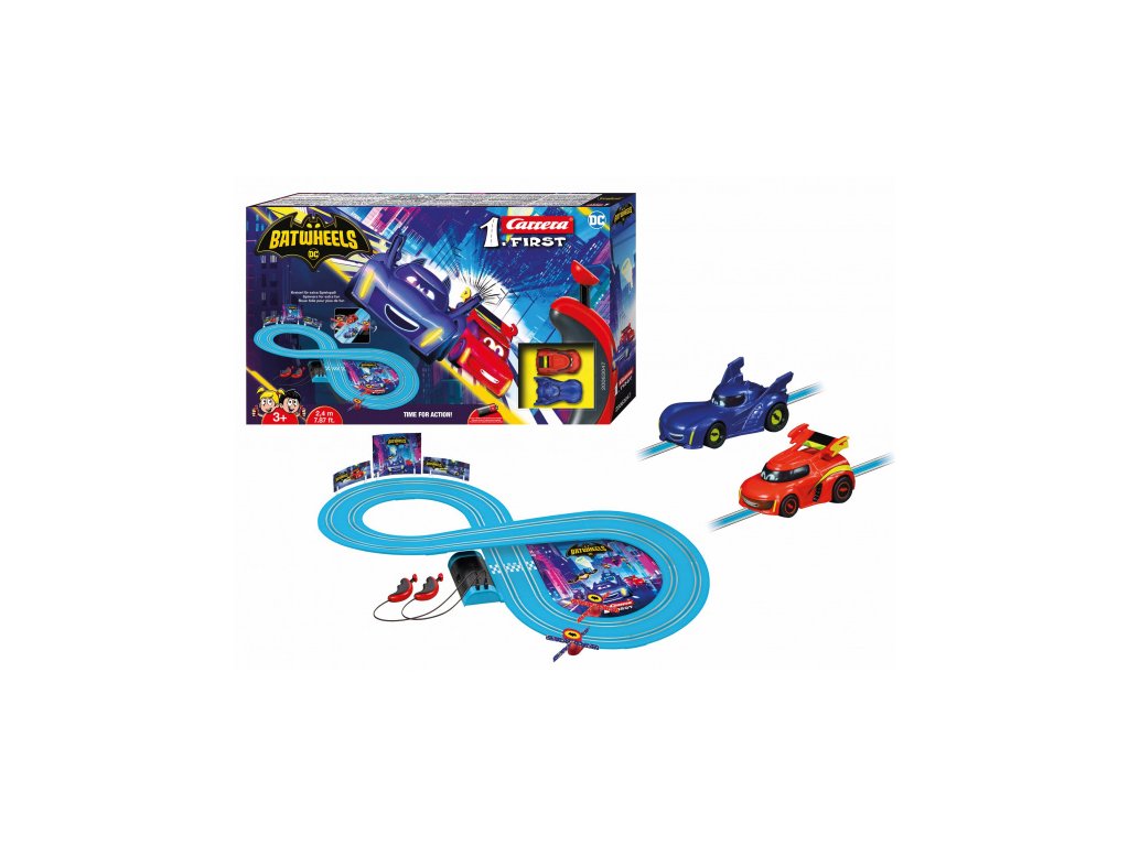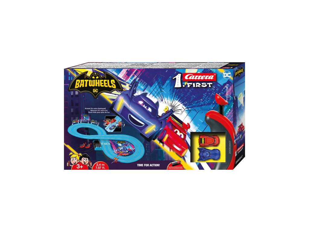 Sada Carrera FIRST "Batwheels - Time for Action" je ultimátní herní závodní autodráha pro juniorské milovníky dobrodružství ve věku od 3 let! Batmanovo auto skočí do akce v sérii Batwheels. „Bam“ je zkratka pro Batmobile. Celý supervýkonný tým podpory superhrdinských vozidel Gotham bojuje v boji proti zločinu. Bat a jeho kamarád Redbird, Robinovo auto, se také připojí k akci na závodní dráze Carrera FIRST. Dvě malá superauta v měřítku 1:50 závodí na jasně modré dráze 2,4 metru v sadě Batwheels Time for Action. Vrtule zaručují další zábavu při hraní. Autodráha Carrera FIRST je perfektním dárkem, který zajistí, že si začínající závodní jezdci užijí nespočet hodin vzrušení.