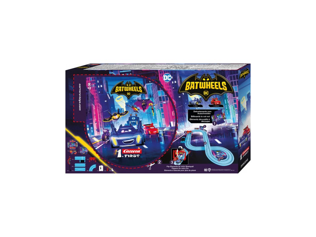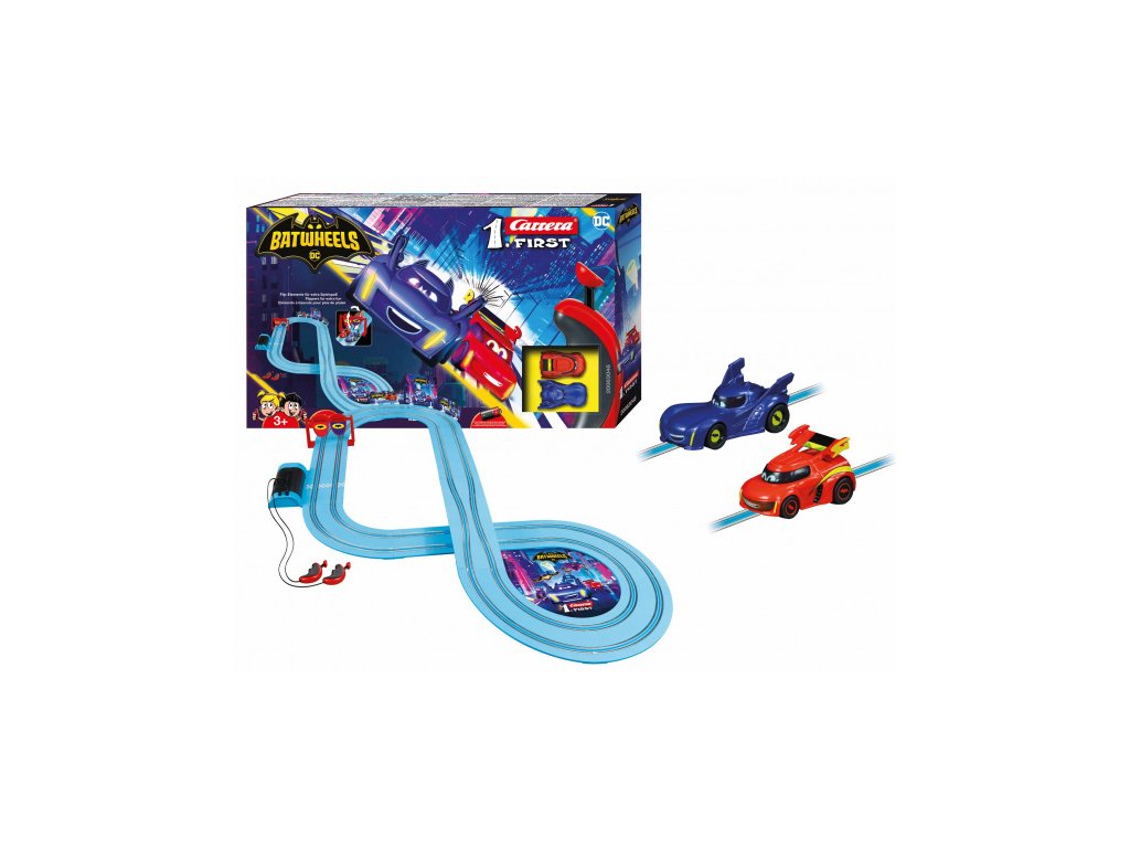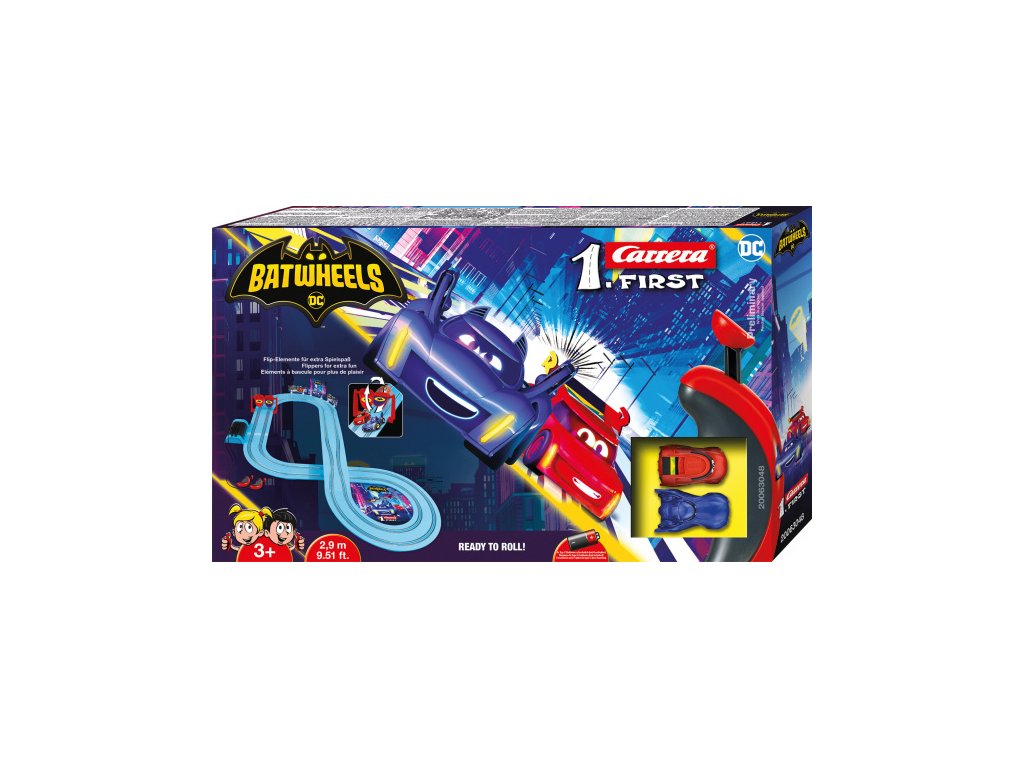 Bam a jeho společník Redbird, Robinovo auto, se připojí k akci na závodní dráze Carrera FIRST. Sada „Batwheels Ready to Roll“ ukazuje, jak se dvě malá superauta prohánějí po modrém závodním okruhu o délce 2,9 metru. Hravé doplňky, jako je hrací automat a sekce se zúžením dráhy, zajišťují ještě více zábavy a četné dekorativní prvky ze série zaručují úsměvy a autentické vzrušení Batwheels!