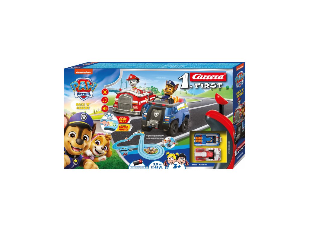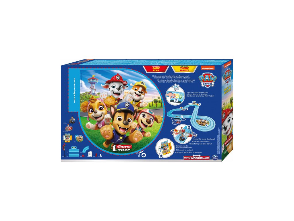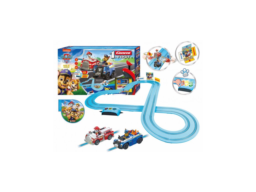 Autodráha Carrera FIRST dlouhá 3,5m s auty ze seriálu Tlapková patrola, pro děti od 3 let, na baterie, obsahuje napájecí díl s interaktivními hrami, zvuky a světly, rovinky, zatáčky, vrtule pro větší zábavu při jízdě, ovladače a dekorace s tématikou Tlapková patrola.