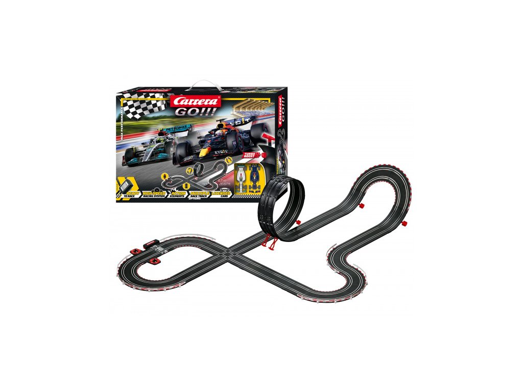 Autodráha Carrera GO!!! dlouhá 6,3m s auty F1 Mercedes a Red Bull, obsahuje looping, křižovatku, kolmou stěnu, rovinky, zatáčky, díl s počítadlem kol a další díly. Můžete si sestavit další různé trati podle své fantazie.